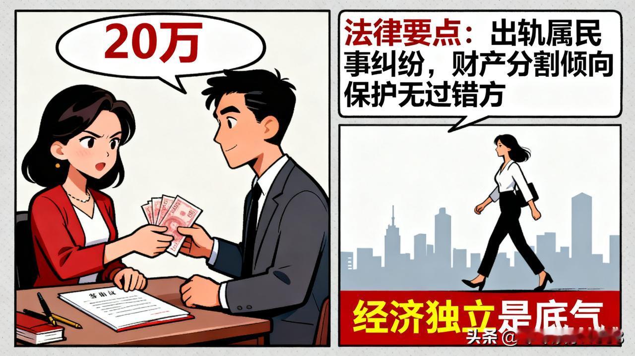 上海一原配抓到丈夫出轨后,为了尽快摆脱纠纷,也不想陷入繁琐的财产分割,给了男方 20 万签了离婚协议。可男方作为过错方,却没有净身出户,这样的结局实在让人意难平。 从法律角度看,补偿款通常是特定法律事件引发的损失补偿。但在这起事件中,原配给男方 “补偿款” 是否合理呢?其实,出轨属于家庭婚姻纠纷,若没有重婚等触犯刑法的行为,更多是按民事法律处理。在财产分割上,法律虽倾向保护无过错方,但原配主动给补偿,可能是为求快速解决。 这也凸显了经济独立对女性的重要性。经济独立的女性在面对婚姻危机时,有足够的底气快速抽身,不用因经济问题在痛苦的婚姻里徘徊。女孩子一定要记住,保持经济独立,才能在风雨来临时,有说走就走的勇气!