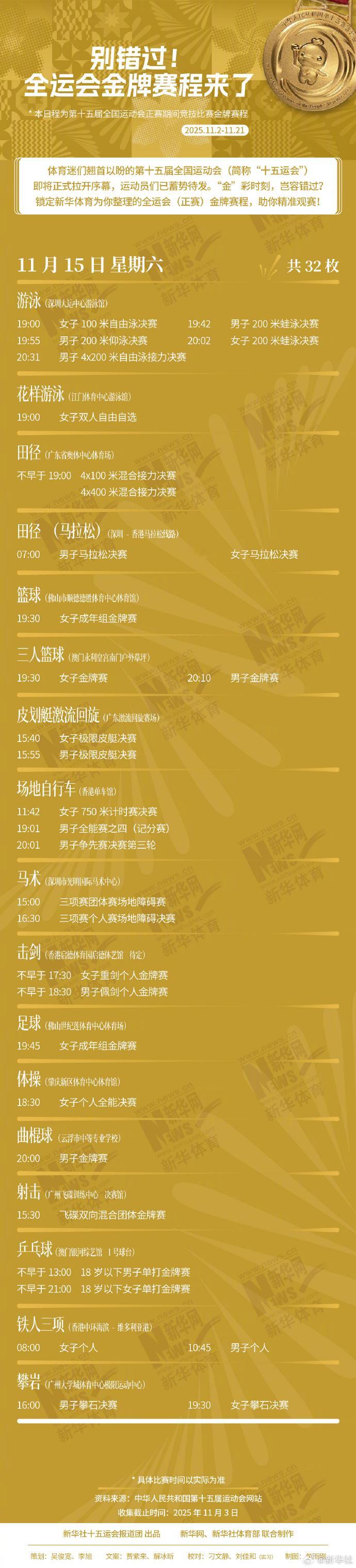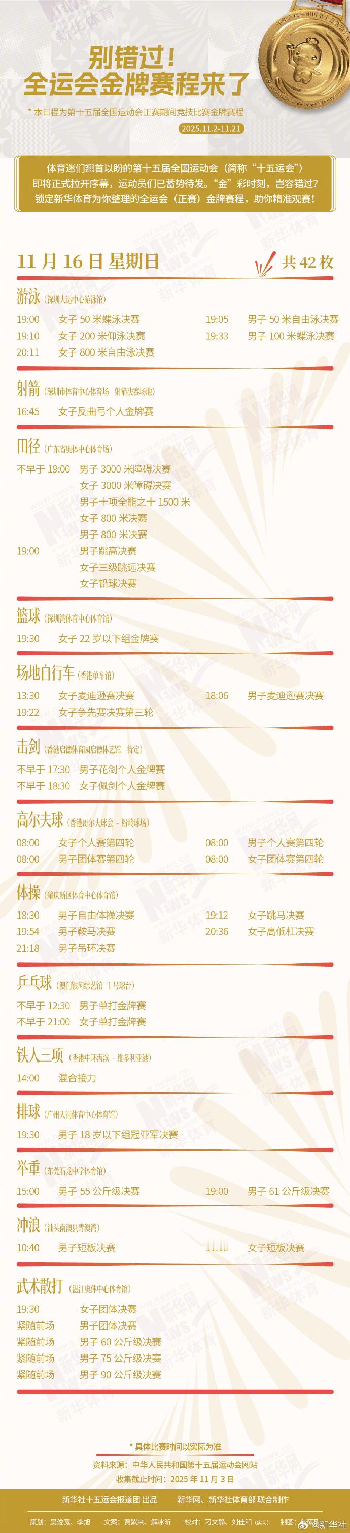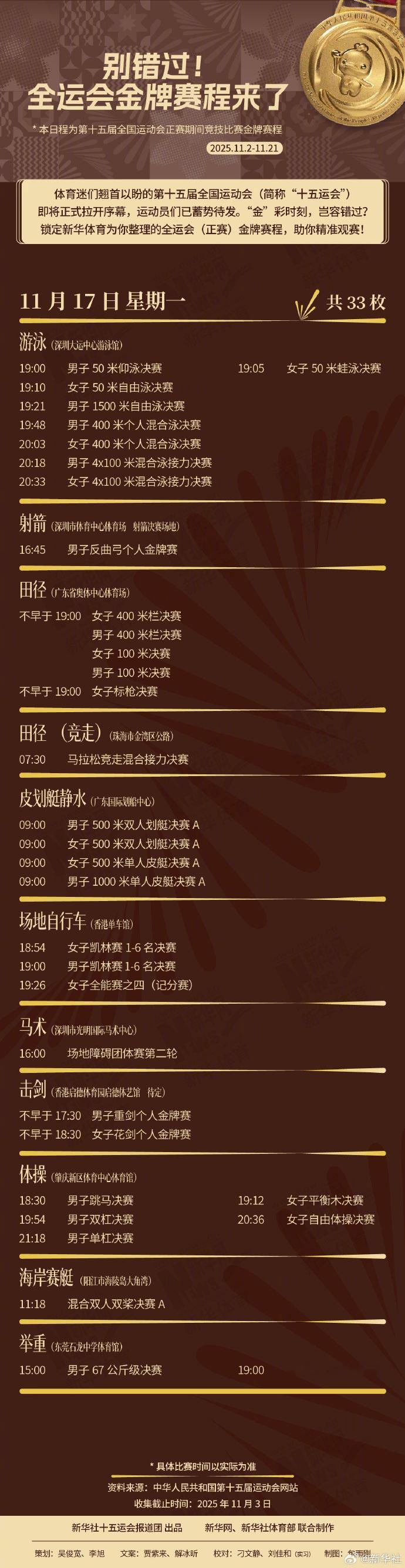 锁定为你整理的全运会(正赛)金牌赛程,助你精准观赛!