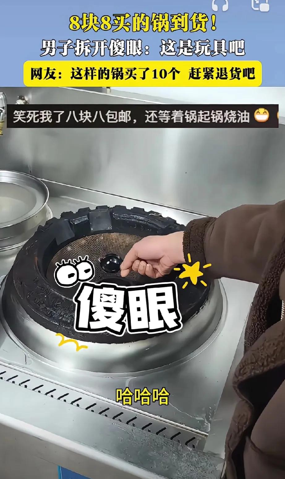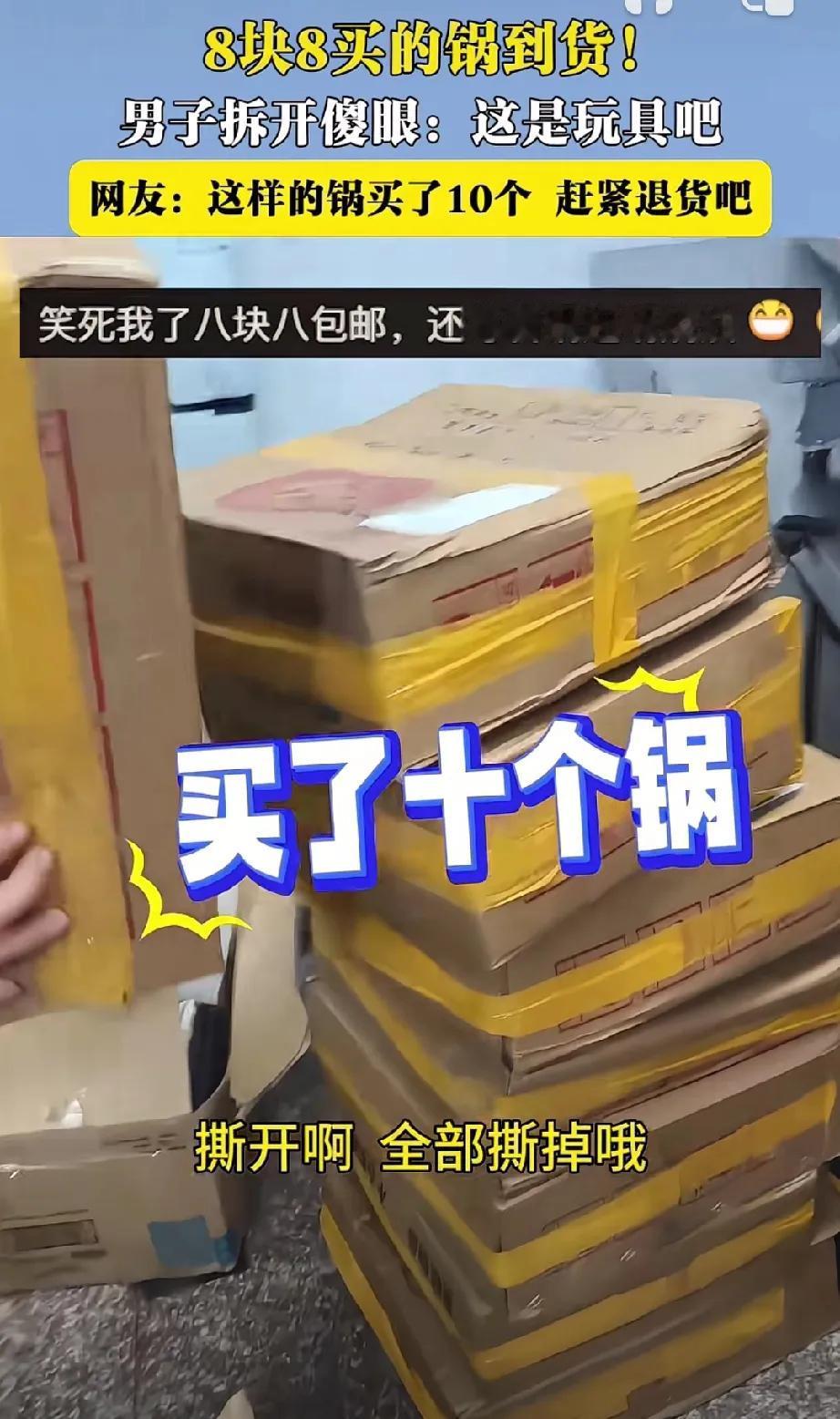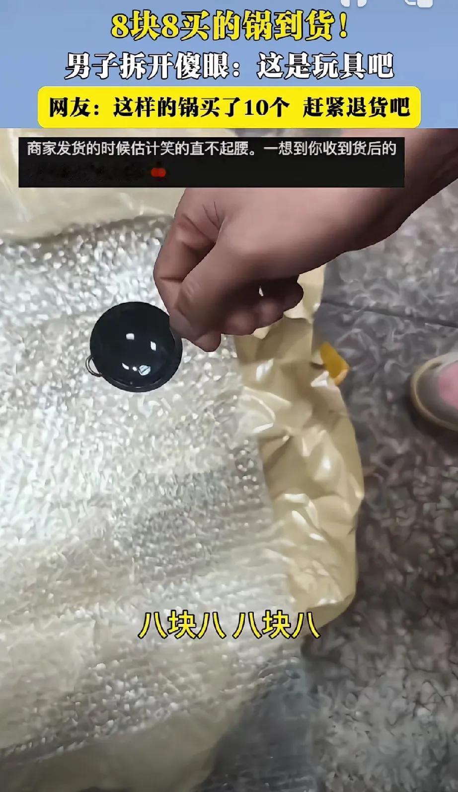 8块8买的锅到货! 男子拆开傻眼! 浙江金华一男子在网上看了一个锅,看着锅挺便宜,才8.8,想着自己用的多,于是一下子买了10个! 等到锅到货了,拆快递的时候,就感觉不太对,重量很轻,完全没有锅的样子。 没想到,打开包装泡沫袋的瞬间,简直不敢相信自己的眼睛,帮忙拍视频的伙伴都看不下去了说:有点不对劲啊!这是玩具吧! 好消息:锅很便宜! 坏消息:锅不大! 惊吓:买了十个!很便宜还不大的锅 !网友:这样的锅买了10个 赶紧退货吧 !