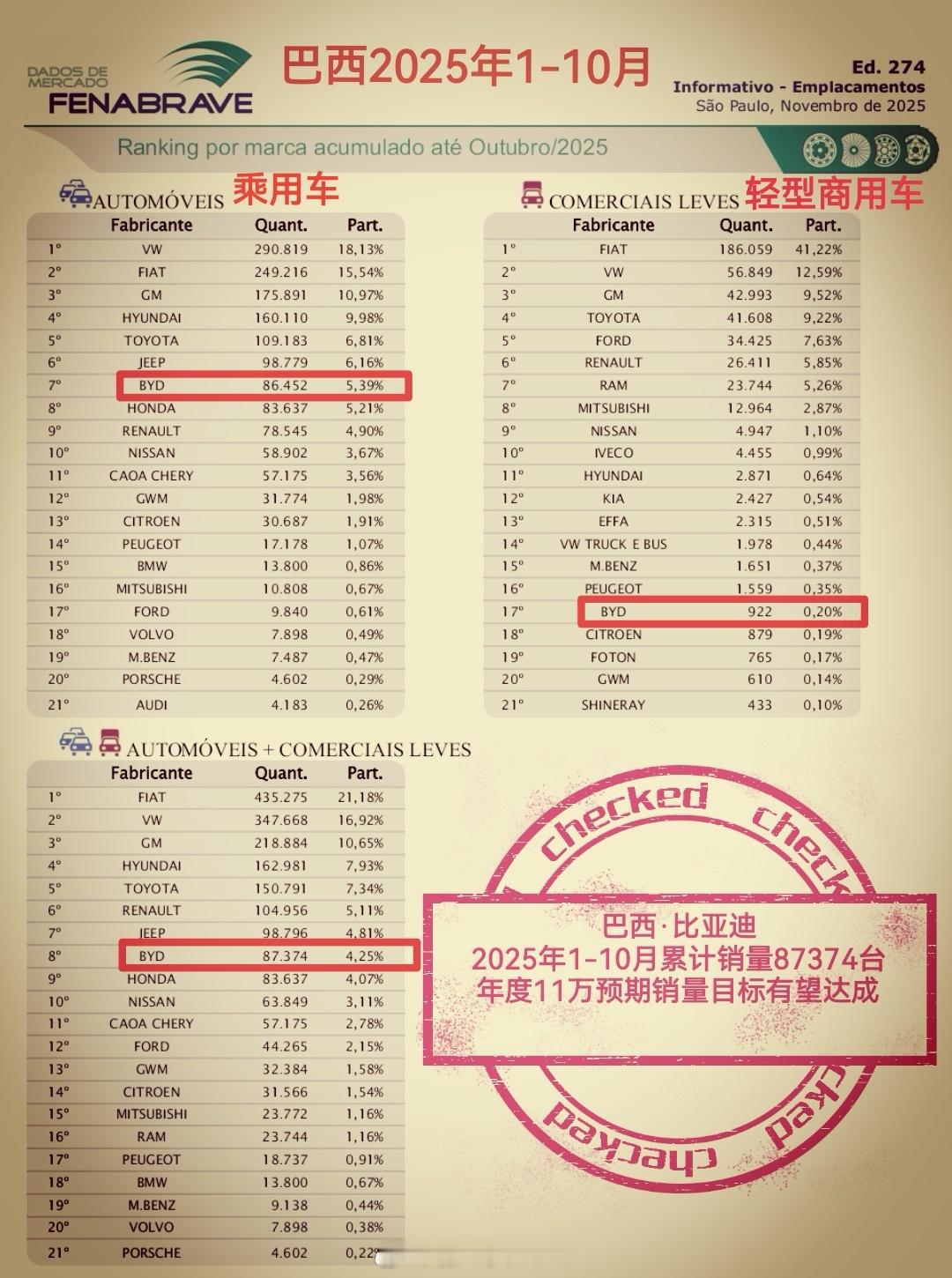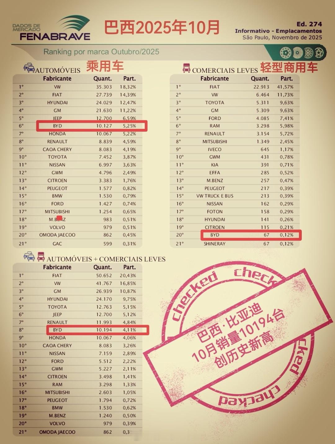 比亚迪巴西◆10月销量10194台,历史新高◆1-10月销量87374台,