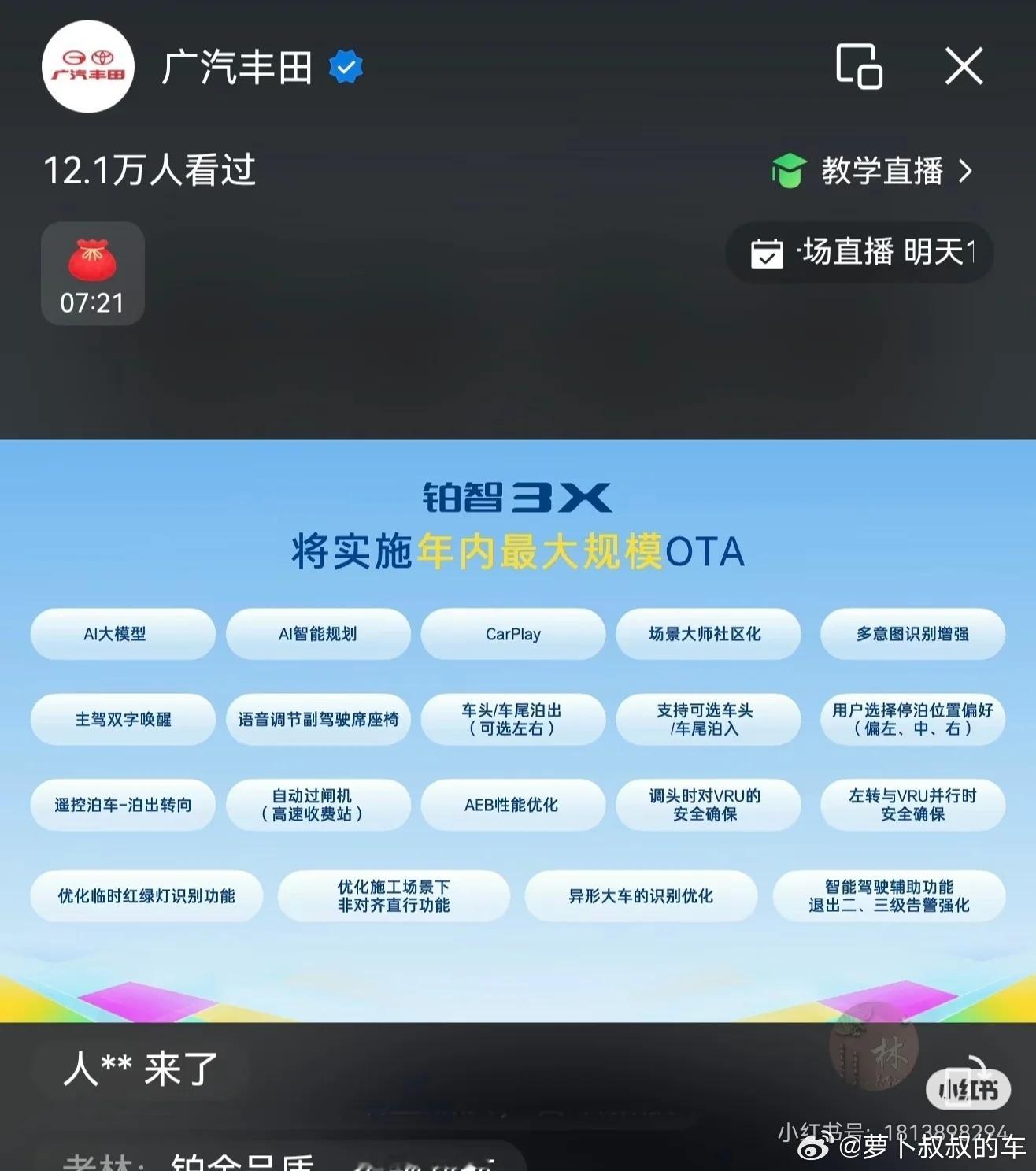 网传广汽丰田铂智3X即将启动年内第二次OTA升级,也是规模最大的一次升级,系统版本是bZ3X OS 2.0!除了Momenta R6飞轮智驾模型,智能泊车大升级,还有苹果CarPlay和AI语言大模型,一起期待铂智3X的完全体。