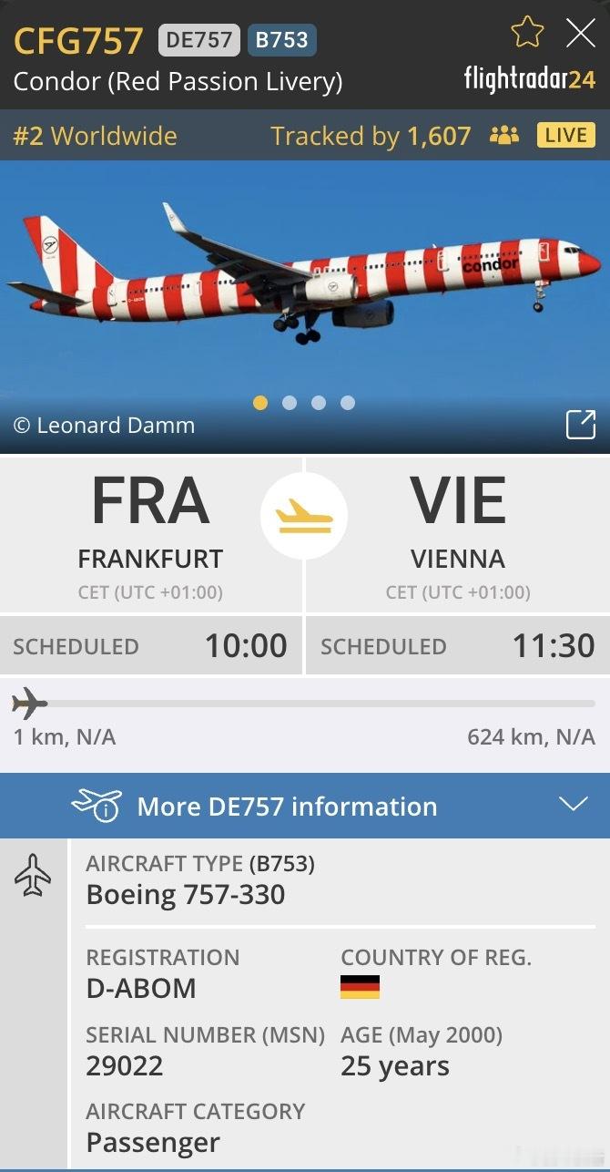 今天(2025年11月5日),该飞机执飞完此次法兰克福到维也纳的往返航班后,神鹰航空将正式结束旗下757机队长达35年的运营历史。