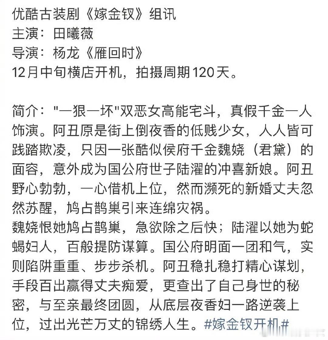 网传电视剧《嫁金钗》12月中旬开机,期待田曦薇大女主[doge]