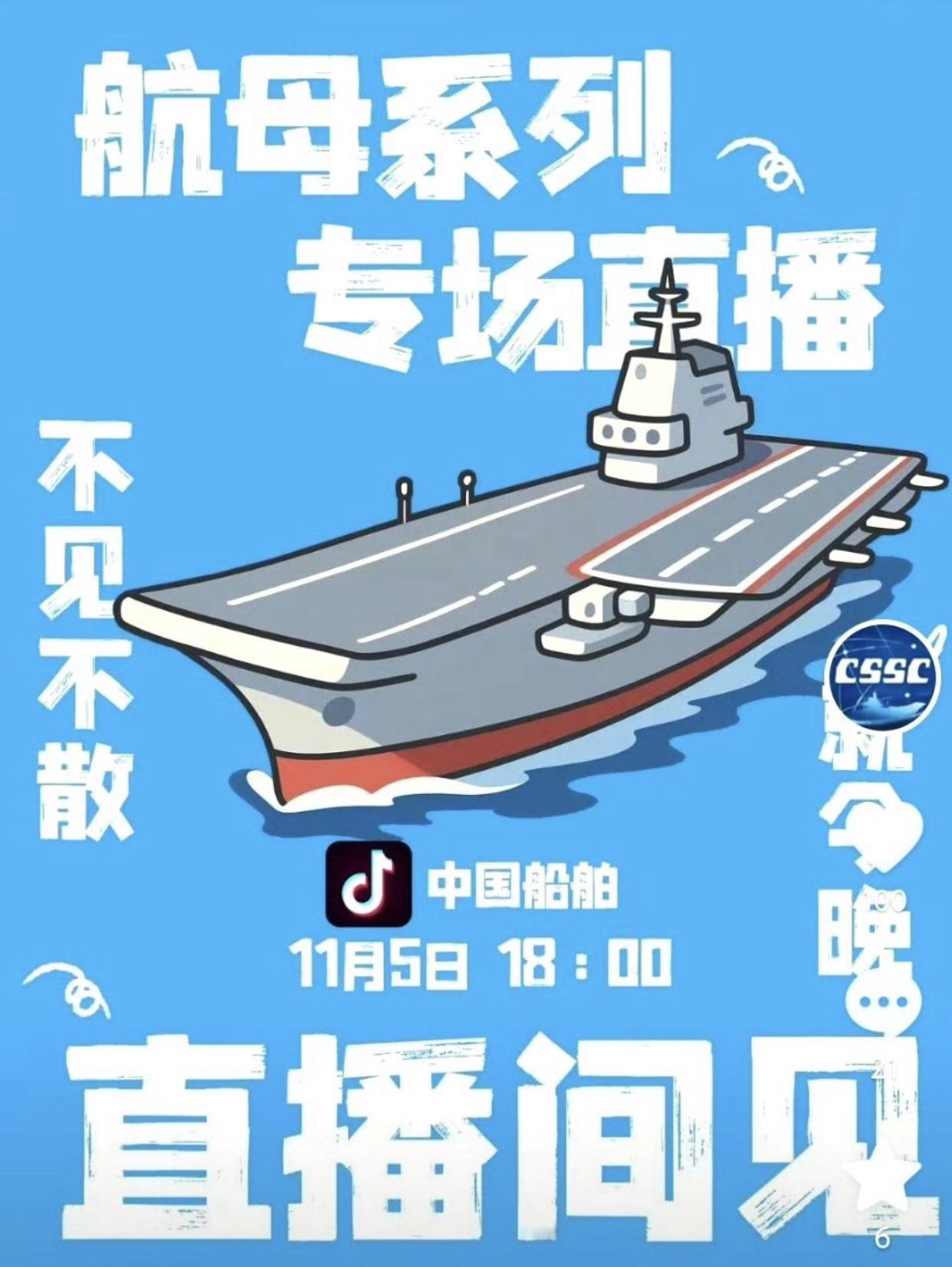 中国船舶:11月5日18点航母系列专场直播,配图福建舰航母! 福建舰航母可能明天或这几天就会服役了,大家期待的三航母编队要来了。