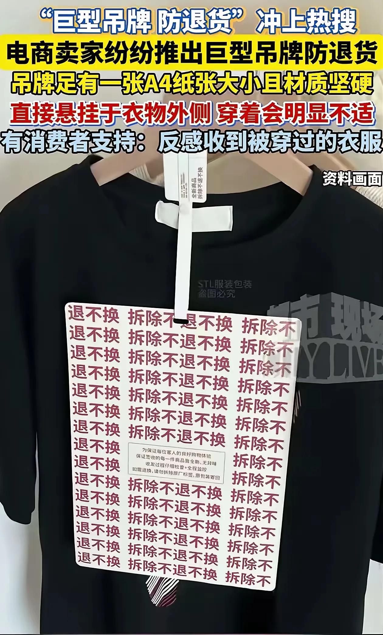 女子网购衣服,收到衣服上挂纸牌:拆除不退不换,网友:支持! 一件羊绒大衣,一个羽绒服,这种高档衣服应该挂这样的纸牌,才能买到没退过的衣服。 防止买到退货的衣服,应该让更多的衣服都挂上这样的纸牌。 但是,也有不同的声音,有网友说,这个纸牌有毛用啊,拆掉吊牌照样可以退货,卖家还会不会卖复原吊牌工具? 麻烦看官老爷们右上角点击一下“关注”,既方便您进行讨论和分享,又能给您带来不一样的参与感,感谢您的支持!