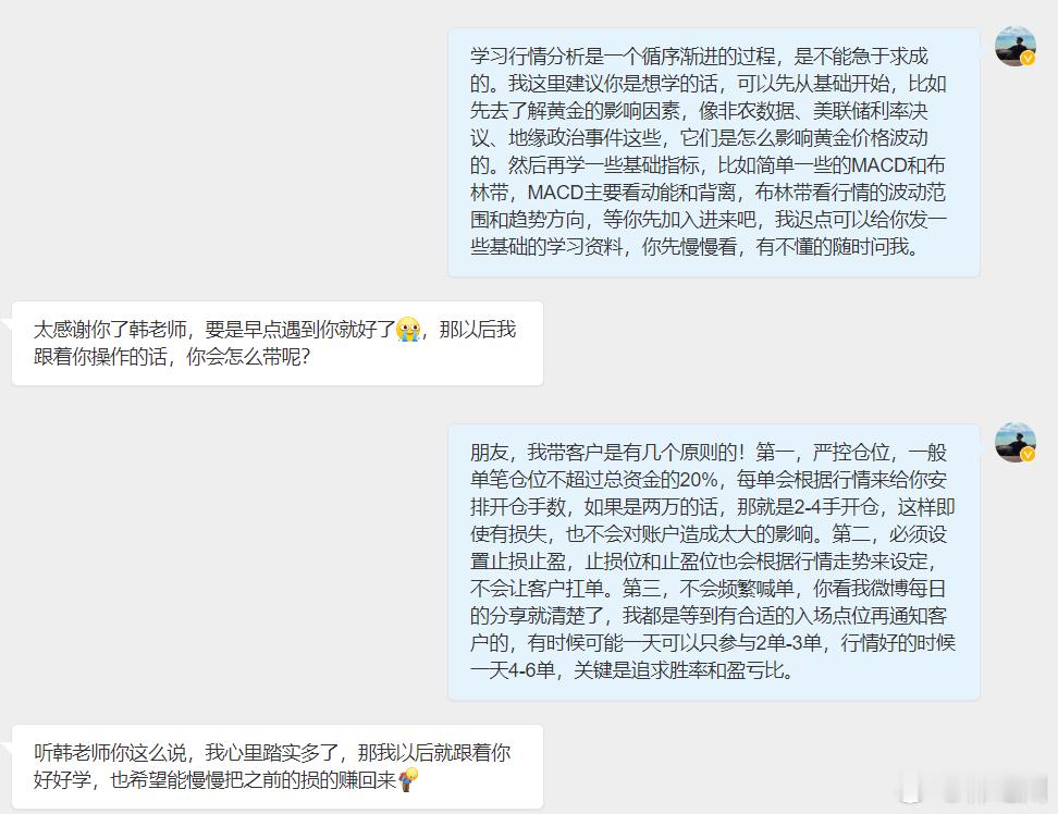 老韩这里想告诫一下大家,如何去跟对一位专业过硬且有实力的老师?好比如微博上,首要第一点则是真实性,先看这位老师的资历和经验,其外就是做单方面的胜率和收获,每日分享的单数,是否频繁分享和操作,其二:不浮夸,博内基本都是行情的讲解和做单的思路分享,实力派最重要,不是那些经常性去吹嘘和吸引的那种,和时不时就马后炮(没给思路单纯吹嘘),且靠着每天都是分享什么出金翻仓,车和房循环,这种是最博眼球的,也是最容易踩坑的!!