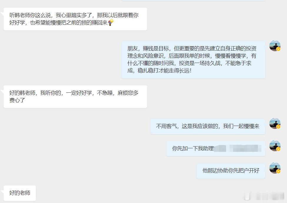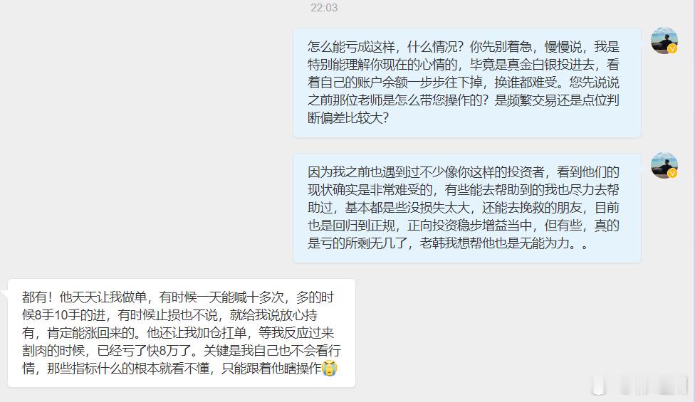 原本是这样的,这位投资朋友呢,他之前是听信了自己一个所谓朋友的谗言,他这位朋友只能说是普通朋友了,说自己跟这位老师的单,目前赚了多少,反正就是说的天花龙凤的,他自己就动心了,谁不知这往往是陷阱的开始,走尽泥潭的重要一步!