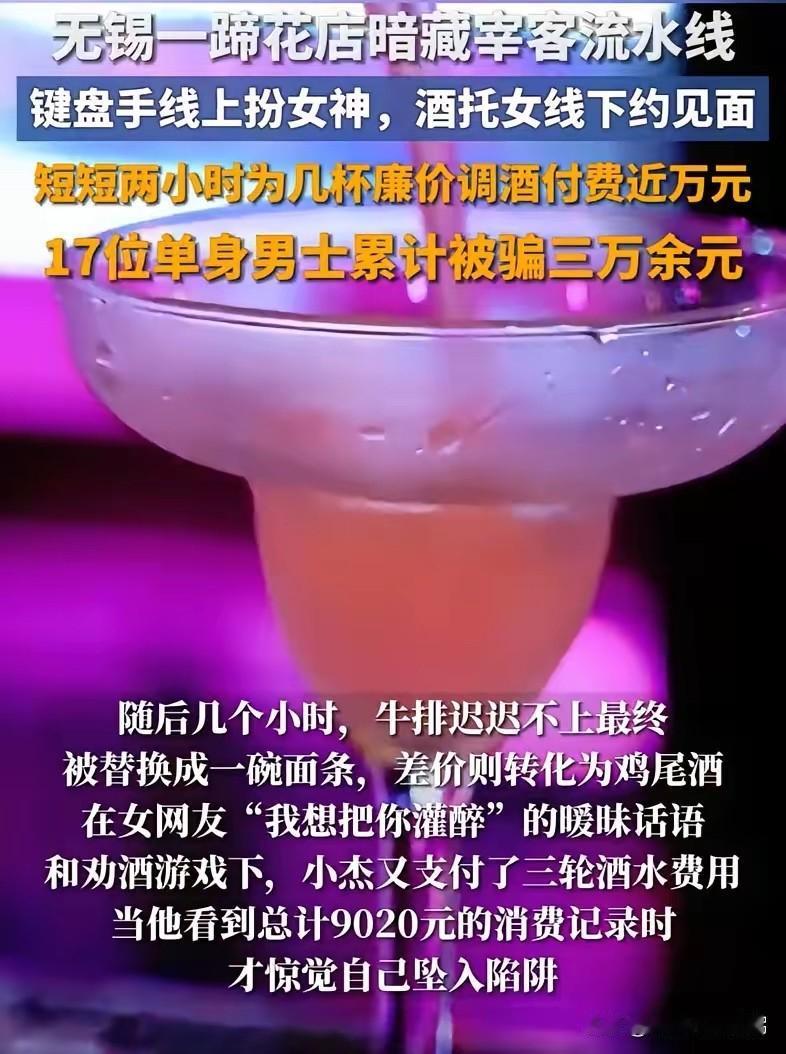 “色字头上一把刀!”江苏无锡,一单身男子约见女网友线下见面,见面后对方穿着火辣,性格开放,男子也是把理性抛在脑后,跟着对方就走进一家蹄花店吃饭,可让他没想到的是,这一趟竟然消费9020元,等他酒醒才意识到,自己是遇到“酒托”了! 2025年3月5日晚的江苏无锡某商业广场,单身男子小杰(化名)在网上结识一位头像靓丽的“女网友”,对方言语热情,短短交流后便主动提出线下见面。 见面后,这位女网友穿着时髦,性格开朗,小杰心里还挺高兴。对方很自然地提议去吃饭,带着他就往广场三楼一家蹄花店走。点菜时,她直接点了战斧牛排、蹄花,又看似随意地加了三杯菜单上未明确标价的鸡尾酒。服务员随即要求小杰扫码支付了第一笔费用952元。 随后几小时,承诺的战斧牛排迟迟没上,最终被换成一碗面条,差价则转为又一杯鸡尾酒。女网友一边玩着小游戏,一边用“我想把你灌醉”等暧昧话语劝酒。在氛围裹挟下,小杰又接连支付了三轮高昂费用。 第二天酒醒查看手机账单,小杰才发现自己竟消费了9020元。他随后报警,才得知自己并非个例。 警方调查发现,这是一个组织严密的“酒托”诈骗团伙。该团伙以马某、赵某为首,“键盘手”在社交平台伪装成单身女性筛选目标,酒托女线下见面并将受害者诱骗至指定店铺进行高额消费。店铺提供虚高定价的劣质酒水,成本仅几元的“特调鸡尾酒”标价上百元。 这类骗局利用了单身男性在交友过程中“不好意思”和“期待心理”,很多受害者因想表现大方、对关系发展抱有幻想,在关键时刻拉不下面子拒绝。有网友评论道:“你以为遇到了小宝贝,其实她把你当花呗。” 2025年9月26日,经无锡市滨湖区检察院提起公诉,法院以诈骗罪判处马某、赵某有期徒刑一年,各并处罚金一万元;冯某等人有期徒刑七个月至一年,各并处罚金三千元。 面对网络交友邀请,尤其在对方主动引导至指定场所进行不明码标价或价格虚高的消费时,务必保持清醒。 各位读者你们怎么看?欢迎在评论区讨论。l
