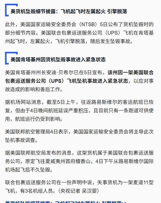【美货机坠毁事故死亡人数升至11人】美货机坠毁细节公布当地时间11月5日,央视记者获悉,美国一名联邦官员当日表示,美国肯塔基州路易斯维尔一架美国联合包裹运送服务公司(UPS)飞机坠机事故的死亡人数上升至11人,其中包括一名儿童。美国肯塔基州坠机事故已致9人死亡 目前,救援人员仍在UPS位于路易斯维尔的全球航空枢纽搜寻更多遇难者,但肯塔基州州长表示,找到幸存者的可能性不大。此外,美国国家运输安全委员会(NTSB)5日公布了货机坠毁时的部分细节内容。美国联合包裹运送服务公司(UPS)飞机在肯塔基州起飞时,左翼起火,飞机引擎脱落,随后发生坠毁事故。(央视)