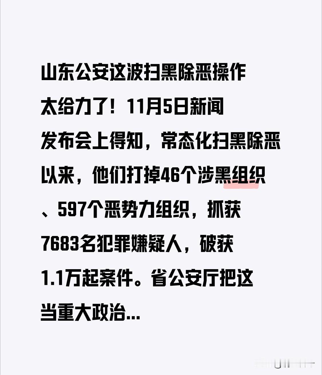 山东公安这波扫黑除恶操作太给力了!11月5日新闻发布会上得知,常态化扫黑除恶以来,他们打掉46个涉黑组织、597个恶势力组织,抓获7683名犯罪嫌疑人,破获1.1万起案件。 省公安厅把这当重大政治任务,有各种文件规范和工作机制。还集中力量专案攻坚,侦破24起部、省挂牌督办案件,“打伞破网”“打财断血”一个不落。在重点行业领域,打掉不少黑恶组织。今年又聚焦群众身边问题,打击“六霸”。有这样的公安守护,安全感直接拉满,必须点赞!