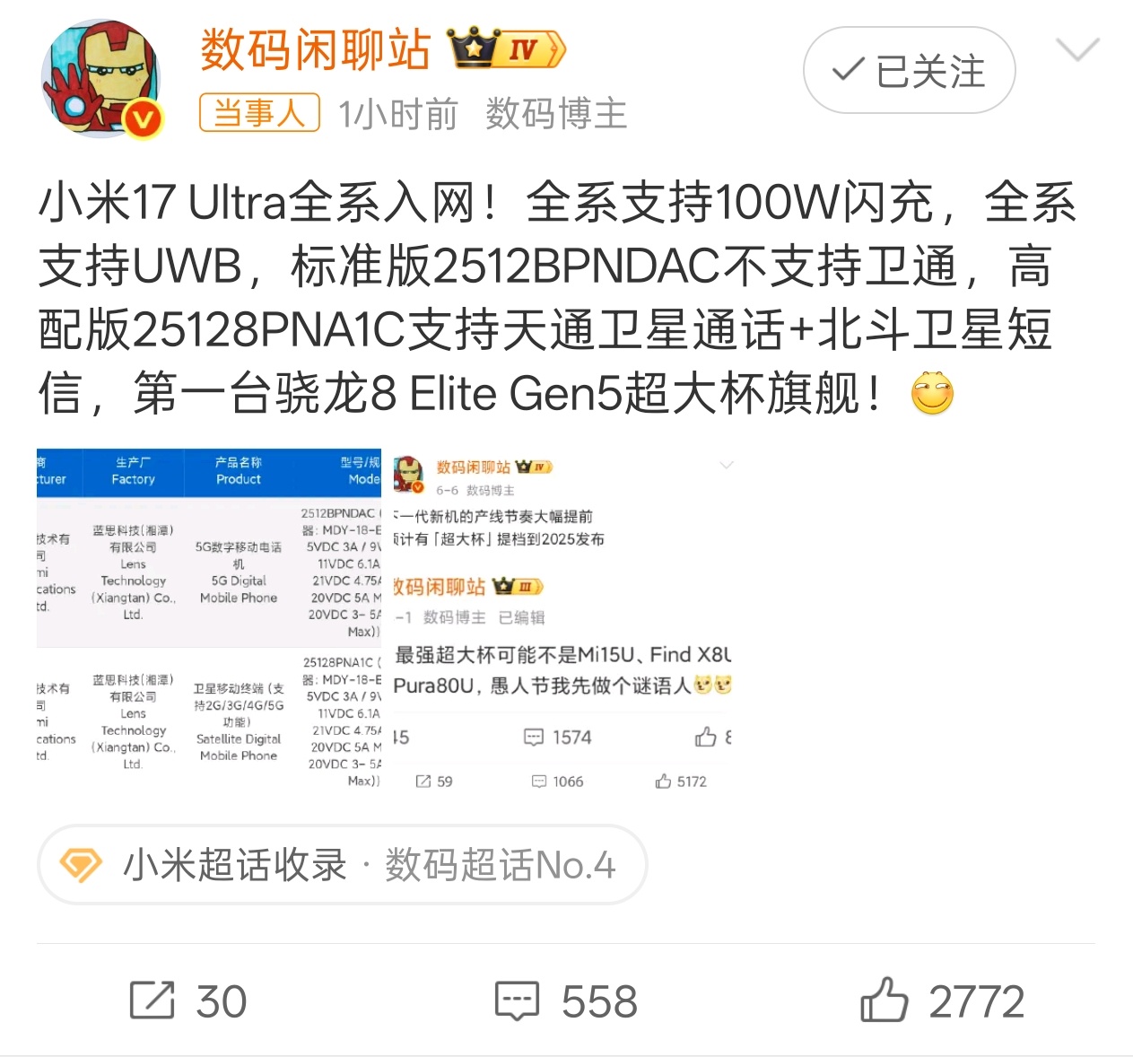 小米17Ultra通过3C认证 貌似是做了两款机型,全系 100W 闪充、UWB,会首发骁龙8 Elite Gen5 ,这是要把超大杯独立出来冲超高端?