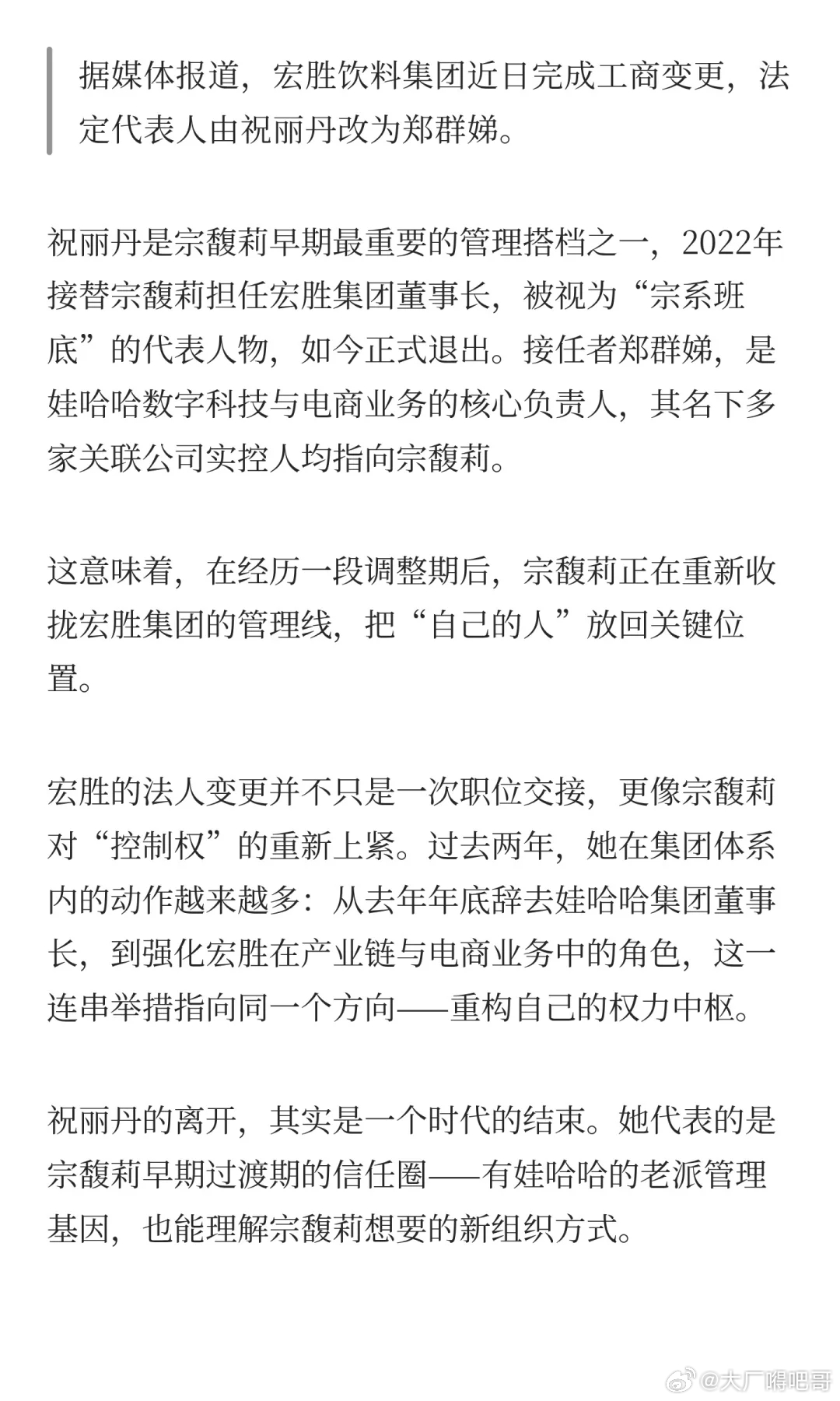 从祝丽丹到郑群娣,宗馥莉开始“去代理化”