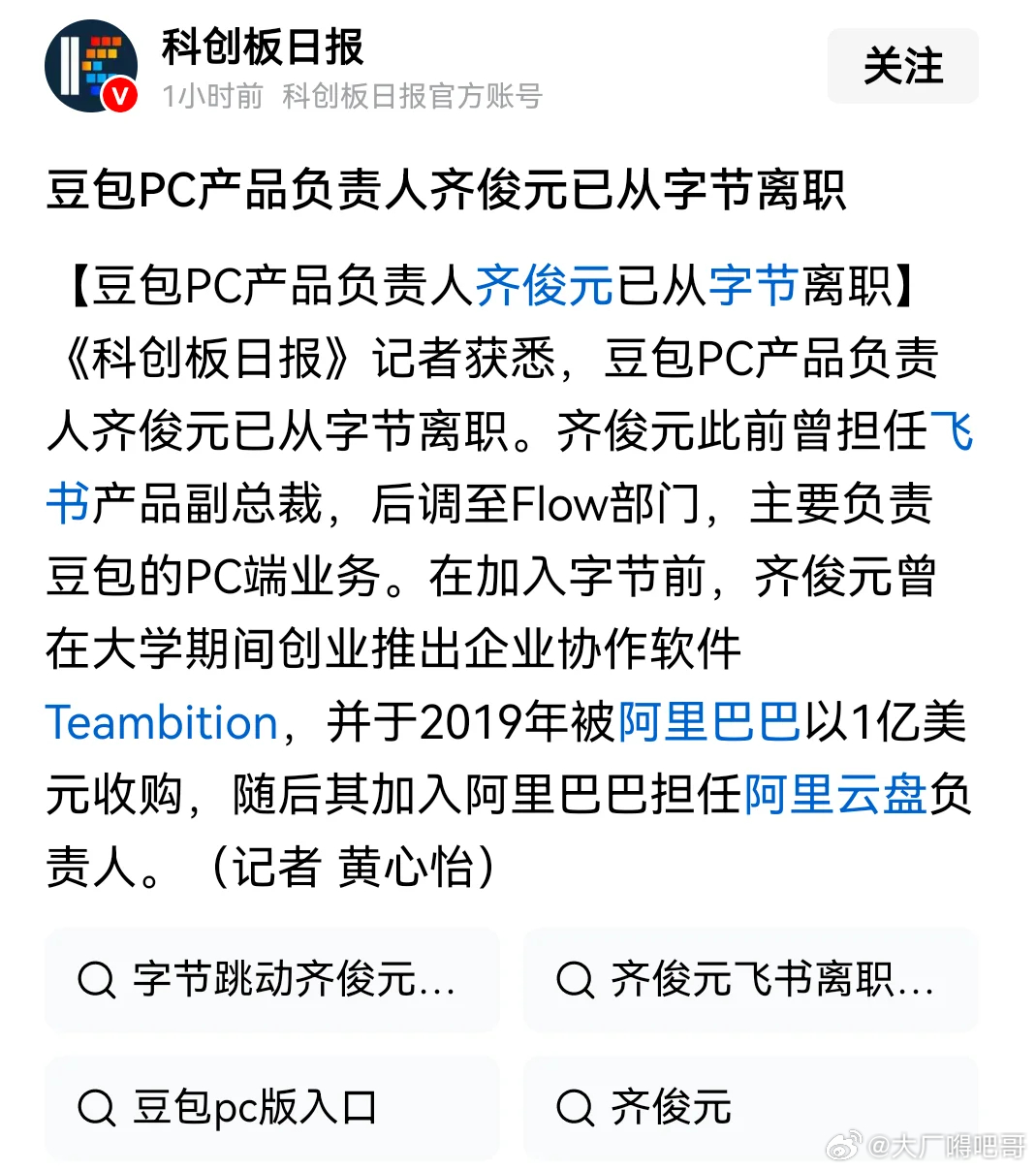 2024年6月起担任字节跳动AI部门Flow产品负责人,后又转岗到豆包,担任PC端负责人,怎么也没干多久就离职了?