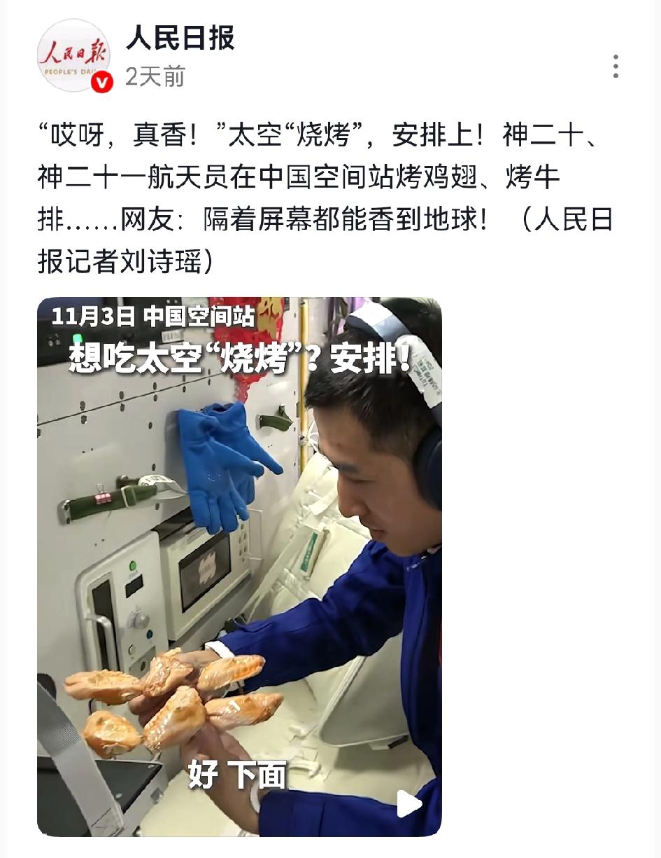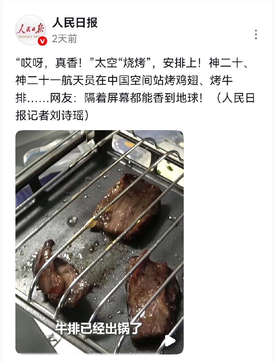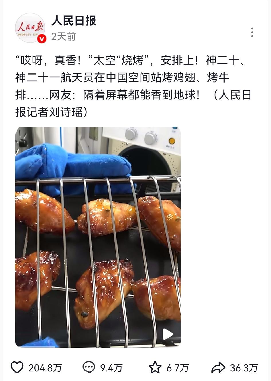 太空烧烤这应该是最完美的烤肉,虽然不是炭火烤的,但是没了重力的约束,肉的汁水不会下沉流出,而是紧紧被束缚在肉的纹理中。同时表皮也不会因为肉的汁水而变得松垮反而会变得焦脆。油脂也不会留下而是和调料一起混合杂糅在脆皮的表面形成晶莹的油膜[惊呆][惊呆][惊呆]。太空站烧烤 太空撸串 太空烤翅