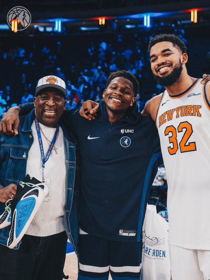 赛后,森林狼官方晒出一张爱德华兹与唐斯父子的合照。