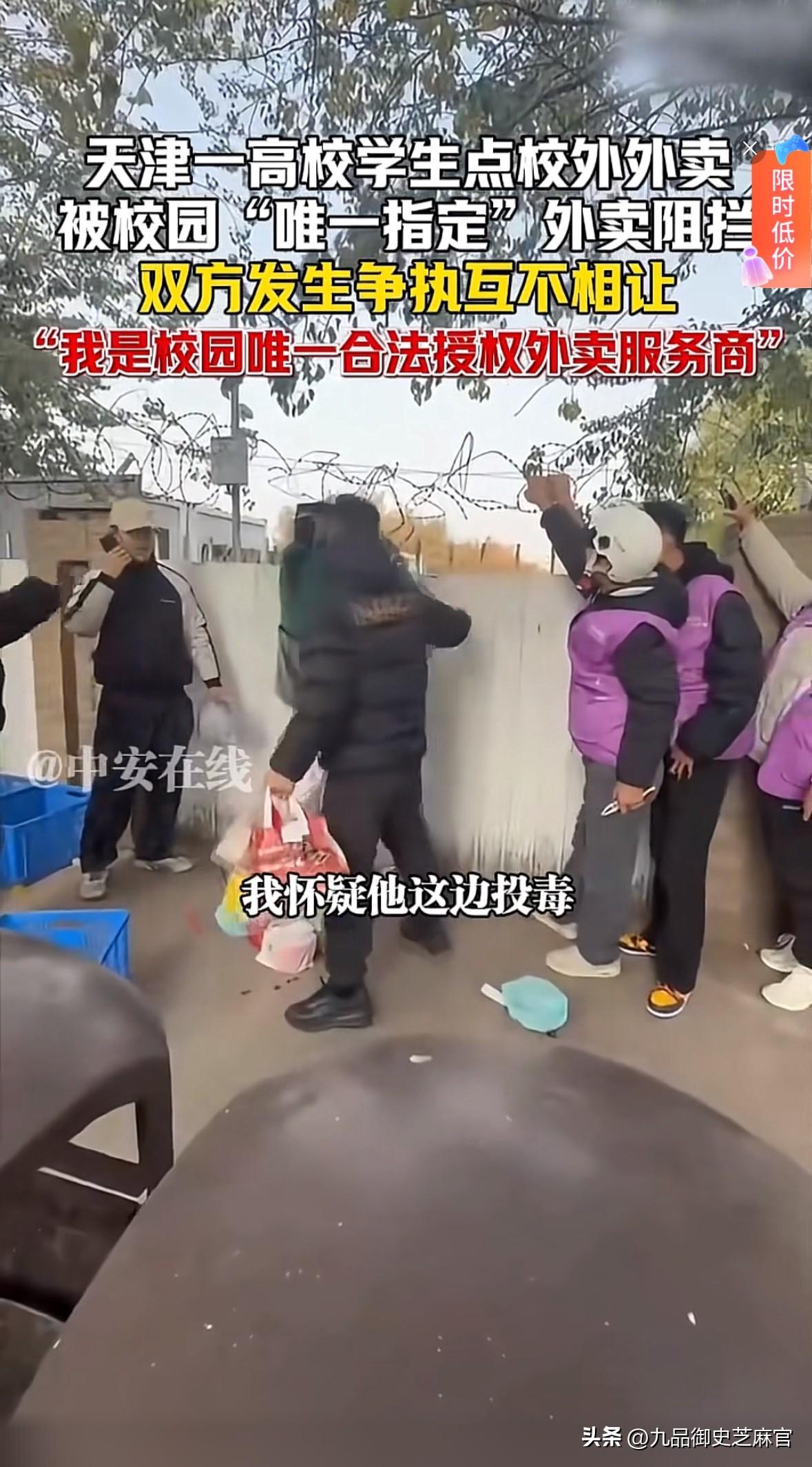 外卖vs唯一指定外卖,有人的地方就有江湖 一社会外卖,为了能够突破阻碍给高校内学生享受到平价外卖这一福利,剪开层层铁丝网,给高墙内投掷物品,却被一男子直接推搡在一起,并联系学校保卫处,声称发现有人投毒。 天津一高校,为了最大限度的保障学生身体健康及理财思维头脑,在校园内指定唯一外卖供货商,吃穿用度,都必须从定制小程序里购买。 当然,遵循市场规律原则,这个外卖供货商的价格,也会比校外贵“一捏捏”,毕竟按照通俗解释,其中包含各项如管理费、建设费、维护费、燃油基建等项目。 事情的原因,不用说大家心知肚明,只能说,教书育人之地,也无法免俗,这才叫人在江湖。外卖市场竞争