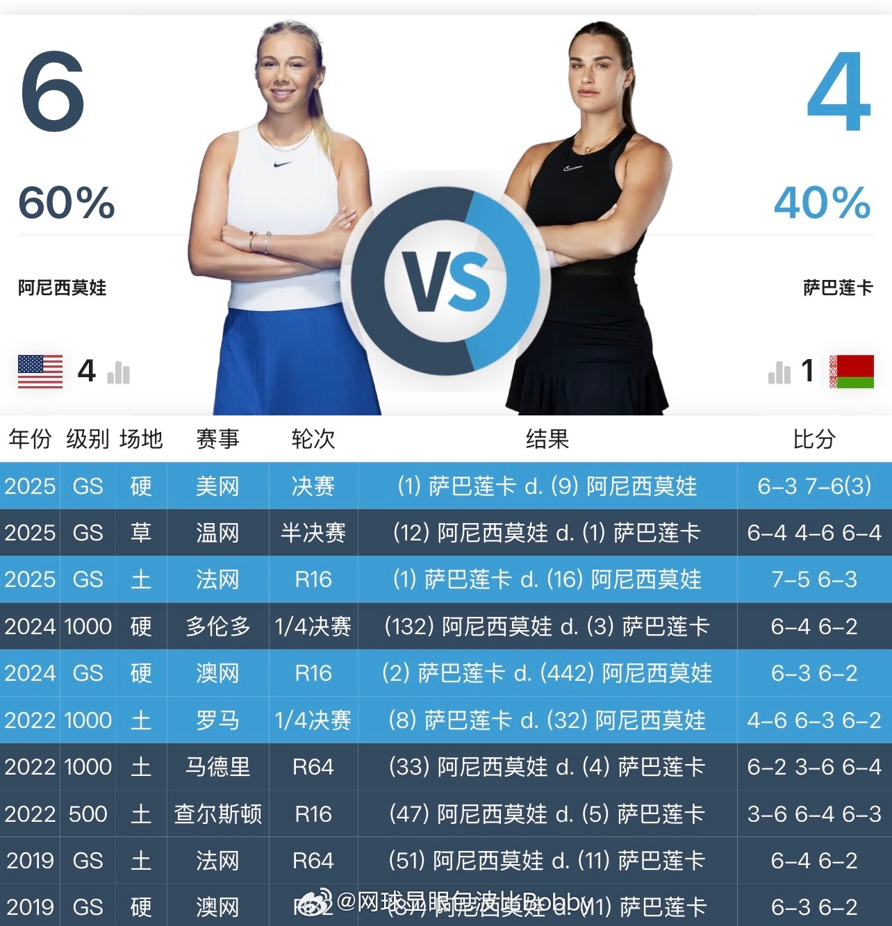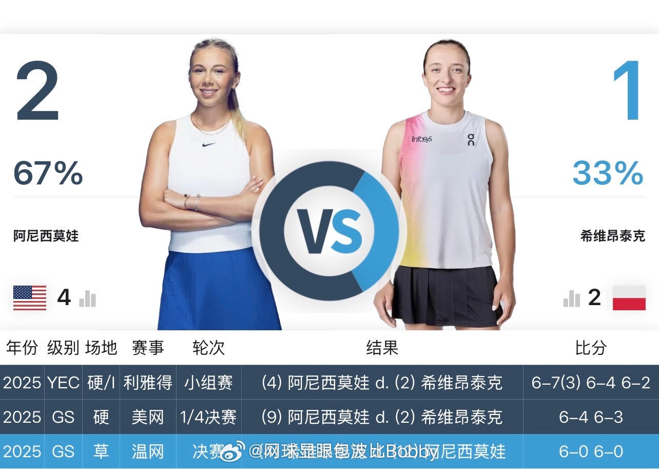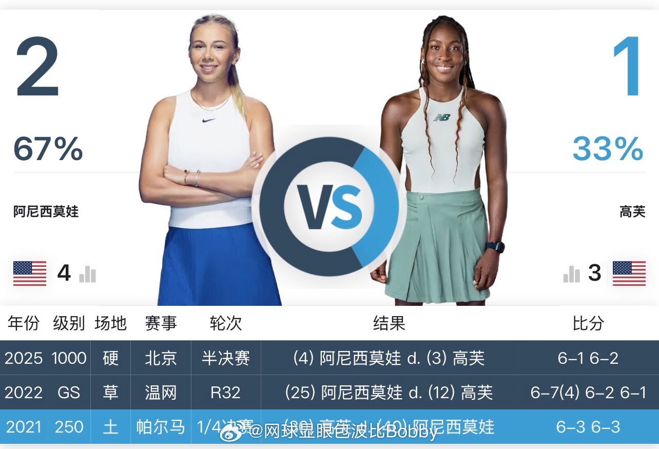 阿尼西莫娃和现Top3️⃣交手记录📝