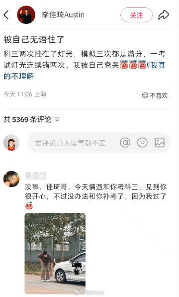 【#李佳琦科目三两次挂在了灯光#】11月6日,发文:“科三两次挂在了灯光,模拟三次都是满分,一考试灯光连续错两次,我被自己蠢哭。”李佳琦自称2022年计划考驾照,因工作繁忙多次推迟。今年9月10日,李佳琦晒图宣布科目一92分顺利通过,此前他曾发视频表示首次科目一模拟考试仅得了11分,第二次36分,第三次55分。10月4日,李佳琦宣布科目二考试顺利通过,实现“一把过”。(现代快报)