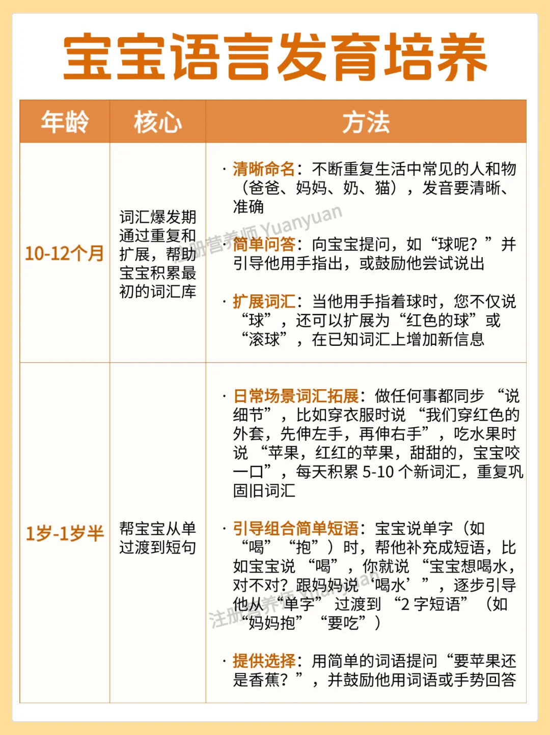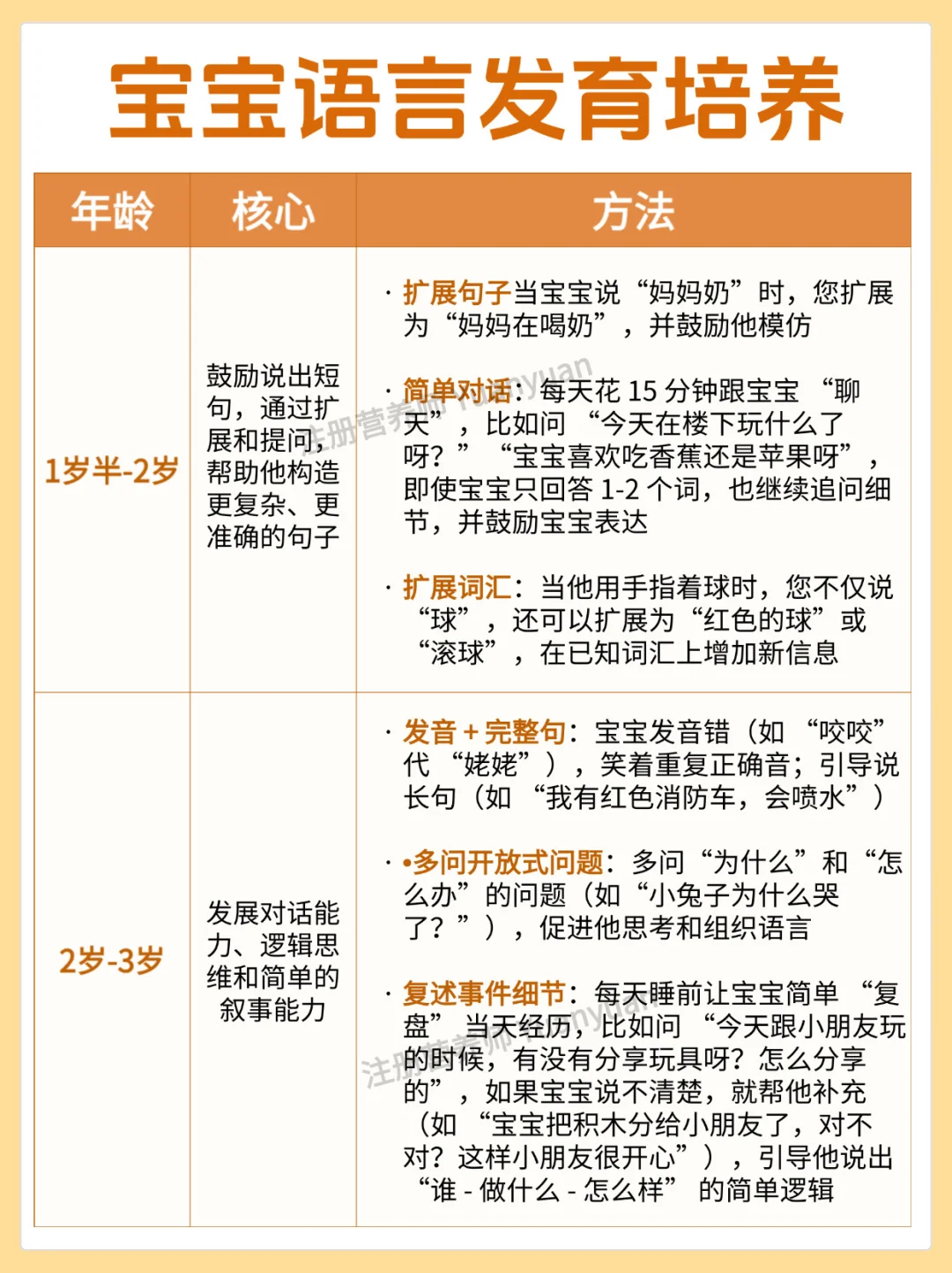 就说语言能力吧,虽然娃1岁才真正开口说话,但负责听懂的韦尼克区,在妈妈孕期就开始发育,到8-20月龄时,突触飙到顶峰,所以早启蒙、早输入真的很重要,具体技巧见图1-4