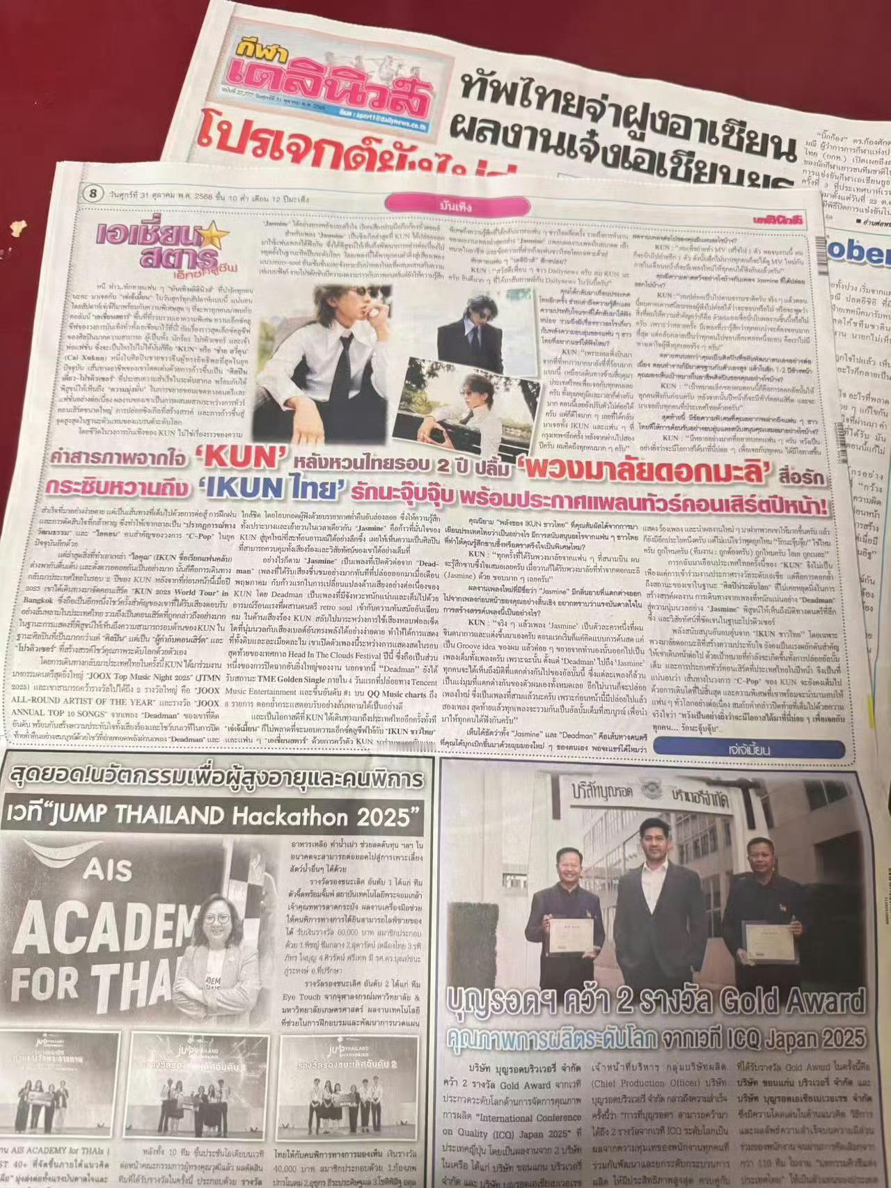 蔡徐坤的采访报道登上泰国的报纸了,火火的很安心。🎉🎉,另外希望蔡徐坤11月9日澳门音乐节的压轴演出依然震惊全球。🎉🎉蔡徐坤[超话]