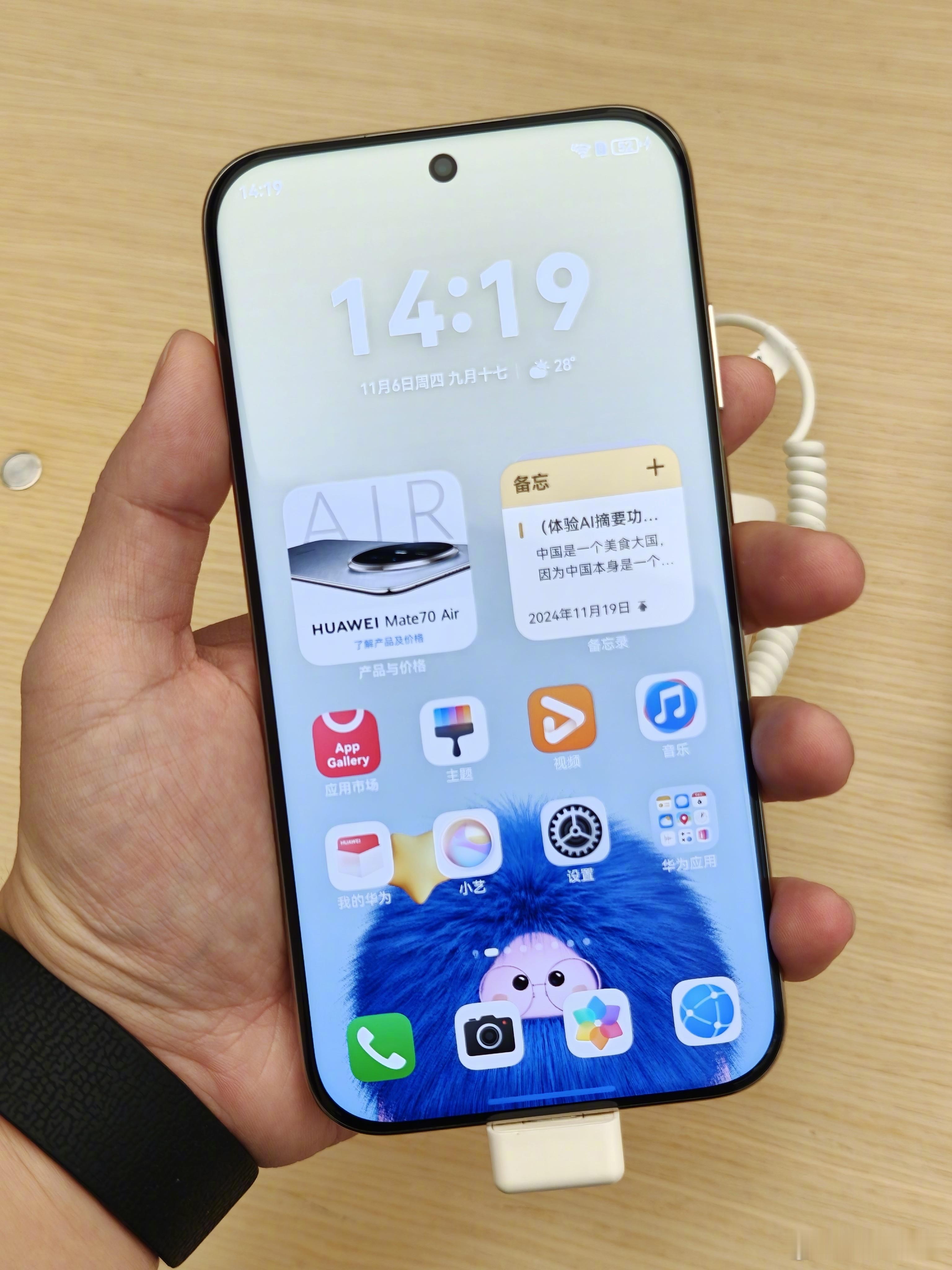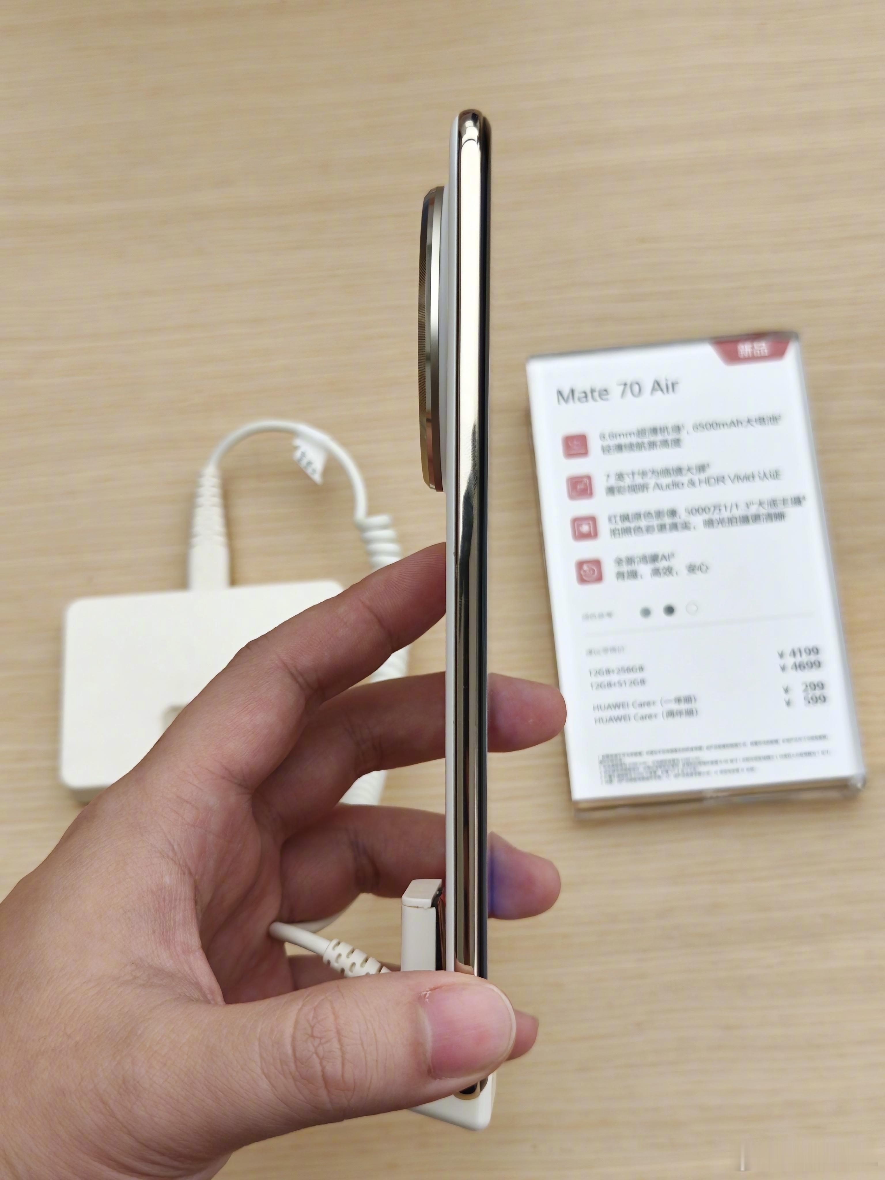 去公司对面华为门店摸了下最新发布的 Mate70 Air,还真是又大又薄。当然 208 克算不上轻,不过这个大屏+圆润边框+薄机身还是能有不错的手感,上手前还有点担心这么宽的机身不舒服。