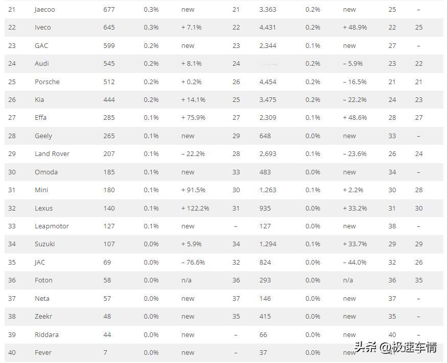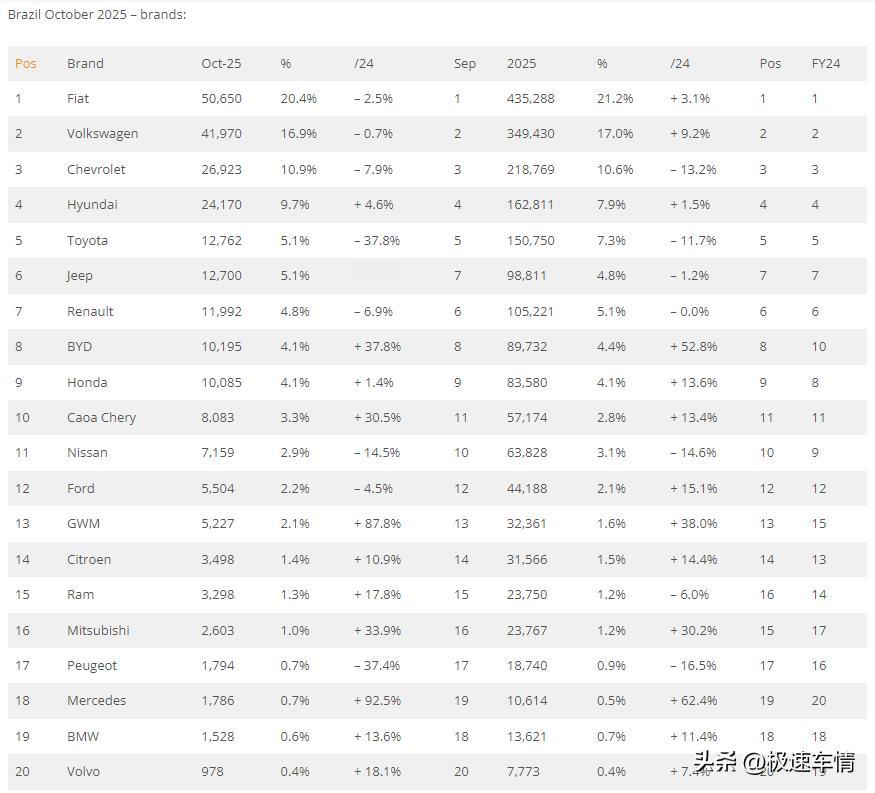 十月,巴西车市微降,头部品牌均下滑。比亚迪、奇瑞、长城代表的中国品牌成为增长主力。中国品牌在主流市场加速渗透,反映出巴西市场电动化转型加速和中国汽车的竞争力继续提升。 2025年10月,巴西新车销量同比微降0.5%,至248,118辆。 2025年1-10月,巴西累计销量同比增长3%,至2,055,699辆。 中国品牌表现出色:比亚迪和奇瑞进入前十! 比亚迪:10195辆,第8名,市占率4.1%。 奇瑞:8083辆,第10名,市占率3.3%。 长城:5227辆,市占率2.1%。 奇瑞Jaecoo:677辆,市占率0.3%。 广汽:599辆,市占率0.25%。 吉利:265辆。 奇瑞Omoda:185辆。 零跑:127辆。 江淮:69辆。 福田:58辆。 哪吒:57辆。 极氪:48辆。 雷达:44辆。