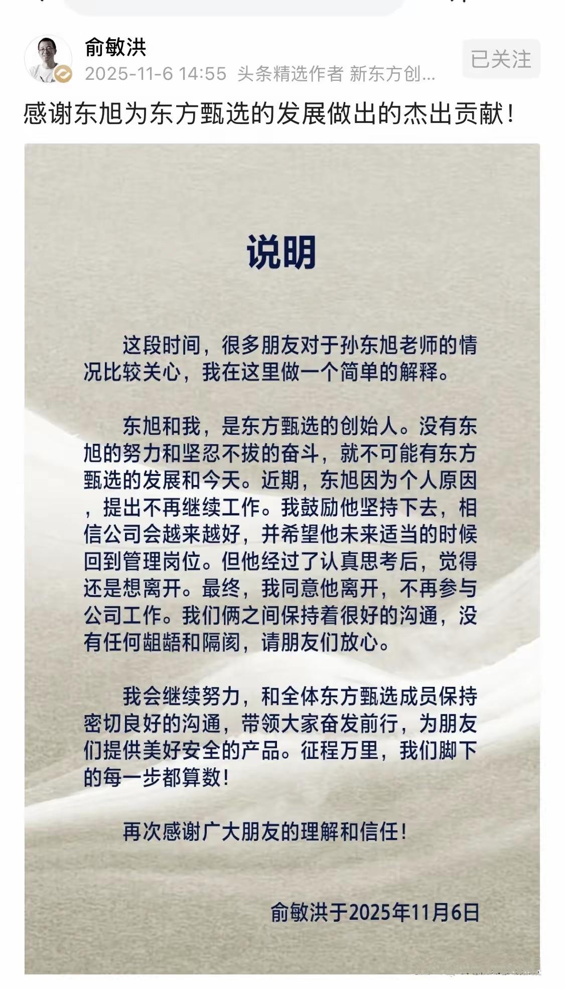 以俞敏洪对董宇辉的做法看,我相信孙东旭离职,确实如老俞说的那样