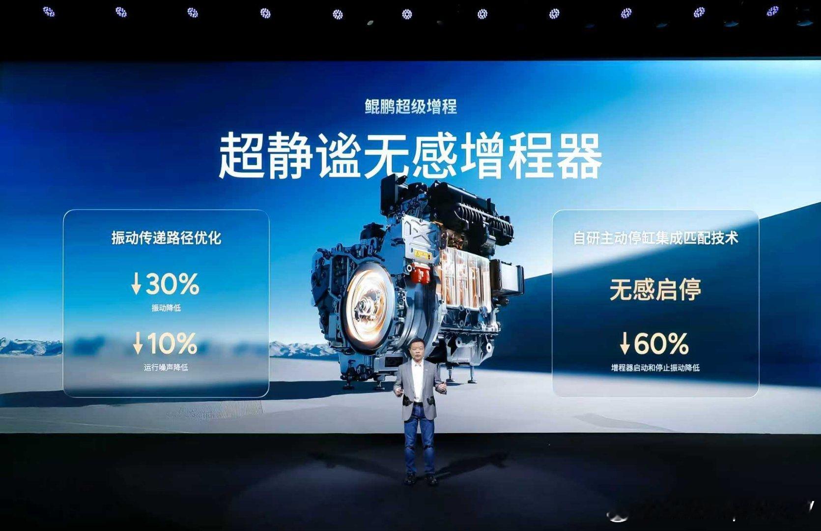 鲲鹏超级增程搭载大电池,能实现90%用车场景都是纯电体验,解决传统增程器启动噪音大的问题。超静谧无感增程器,通过振动传递路径优化,实现增程器振动降低30%,运行噪声降低10%。加上小鹏自研主动停缸集成匹配技术,增程器启停和停止振动下降60%,实现无感启停。