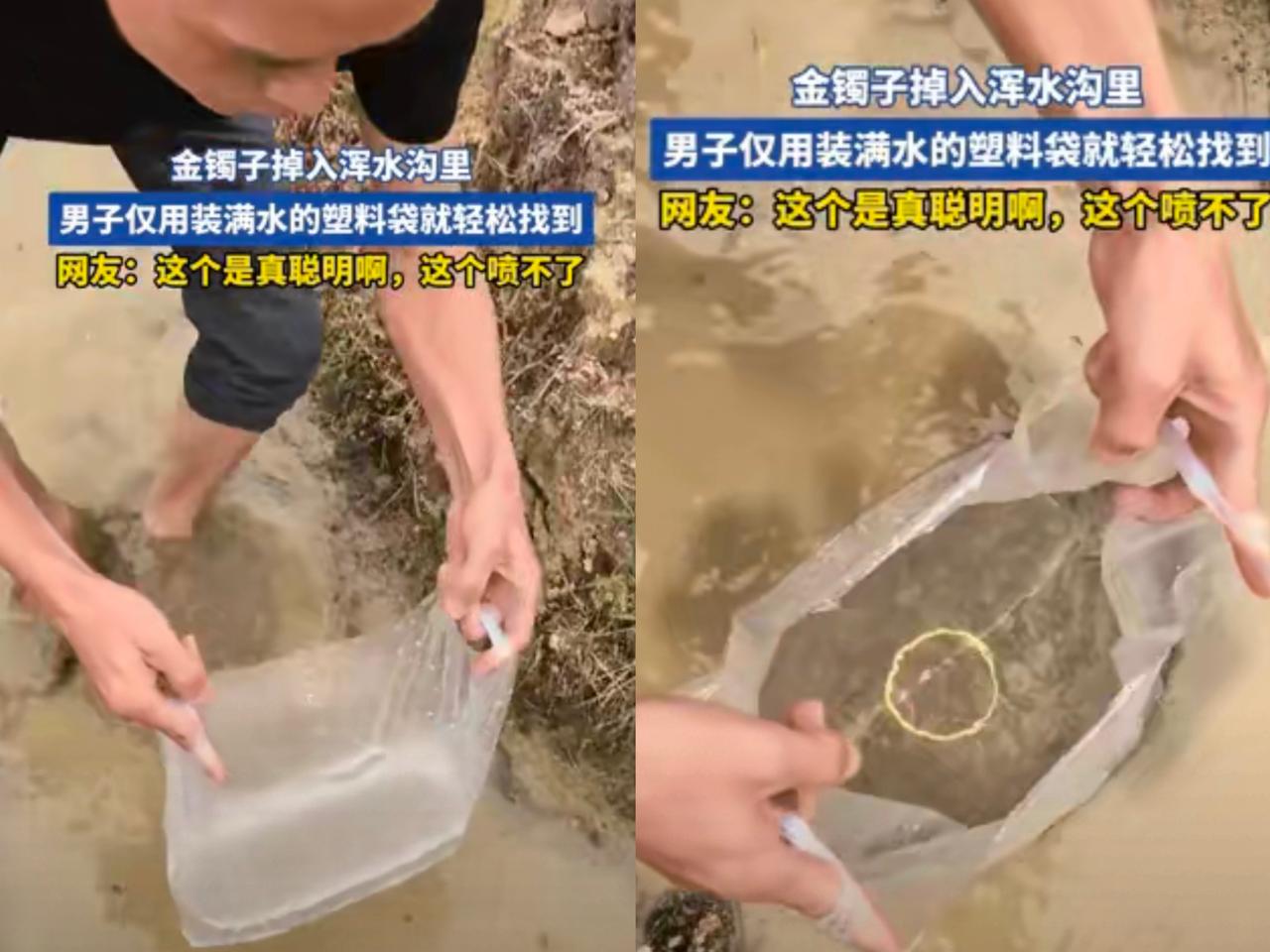 人怎么可以聪明到这种地步!”福建一女子金手镯不小心掉进了浑水沟里,男子立马跑到岸边找到一个透明塑料袋,里面装满清水,放到掉手镯位置,立马就找到了!网友感叹:“这个是真聪明,喷不了!” 他就找了个透明塑料袋,装满清水往掉手镯的位置一放,原本看不见底的浑水,金手镯立马原形毕露,这操作简直绝了!其实原理超简单,装满水的塑料袋形成了“人工清澈层”,让光线反射路径更短,成像更清晰,硬是把浑浊的水沟变成了“透视镜”。 很多人说浅水伸手就能摸,深水这方法没用,但我觉得这事儿的关键根本不在实用性。生活里遇到难题,大多人只会慌神或蛮干,而这位大哥能快速调动生活智慧,用简单技巧解决问题,这才是最值钱的。 真正的聪明从不是懂多少大道理,而是能把普通知识用在刀刃上。你生活中遇到过这种“神操作”吗?或者换做你,会想到什么好办法?快来评论区聊聊~你问我答金镯子 浑水 聪明