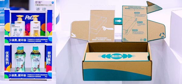 在包装创新方面,今年在进博会现场全球首发隐扣箱,灵感源自传统榫卯结构,减少了胶带的使用,提升了纸箱回收的便利性。同时即展®可重复使用展示箱二代也正式亮相,其在整个生命周期中极大程度减少材料消耗和污染,箱体对比一代使用塑料更少,使用场景更加灵活多样,真正实现高效陈列与环境友好。
