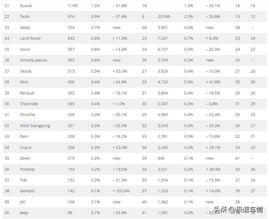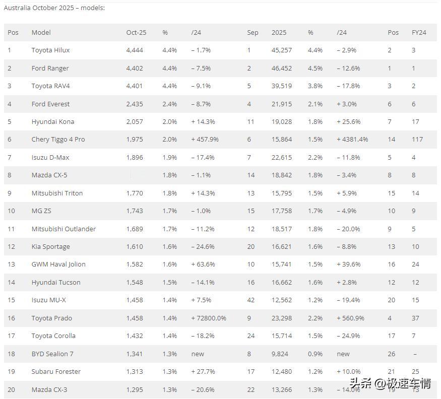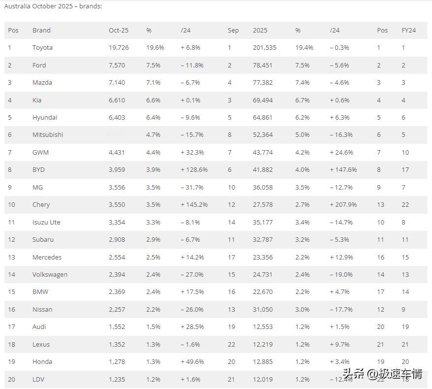 十月,澳洲车市微增,电动化(BEV+PHEV)汽车继续高增长。中国品牌表现不错,长城、比亚迪、奇瑞、名爵跻身前十。中国汽车在澳州的影响力持续提升中。 2025年10月,澳大利亚新车销量同比微增0.7%,至100,658辆。 2025年1-10月,累计销量同比微增0.4%,至1,039,618辆。 汽车原产国格局:中国产成唯一增长 日本产汽车:销量下降2.9%,至27,716辆。 泰国产汽车:销量下降5.5%,至20,811辆。 中国产汽车:销量增长32.5%,至 20,405 辆,市场份额占比达20.3%。 韩国产汽车:销量下降9.1%,至12,455辆。 德国产汽车:销量下降1.8%,至4,928辆。 中国品牌表现出色,再次在品牌前十榜单见到4家中国品牌:长城汽车(GWM,+32.3%)蝉联第7;比亚迪(+128.6%)下滑2位至第8;名爵(-31.7%)表现低迷,位列第9;奇瑞(+145.2%)再次位列第10,连续8个月创下销量新高。 吉利(Geely)环比上升 5 位,创纪录升至第23位。 长城:4431辆,市占率4.4%,第七名。 比亚迪:3959辆,市占率3.9%,第八名。 名爵:3556辆,市占率3.5%,第九名。 奇瑞:3550辆,市占率3.5%,第十名。 上汽LDV:1235辆,市占率1.2%。 吉利:704辆,市占率0.7%。 奇瑞Omoda&Jaecoo:565辆,市占率0.6%。 极氪:216辆。 江淮:106辆。 深蓝:82辆。 零跑:64辆。
