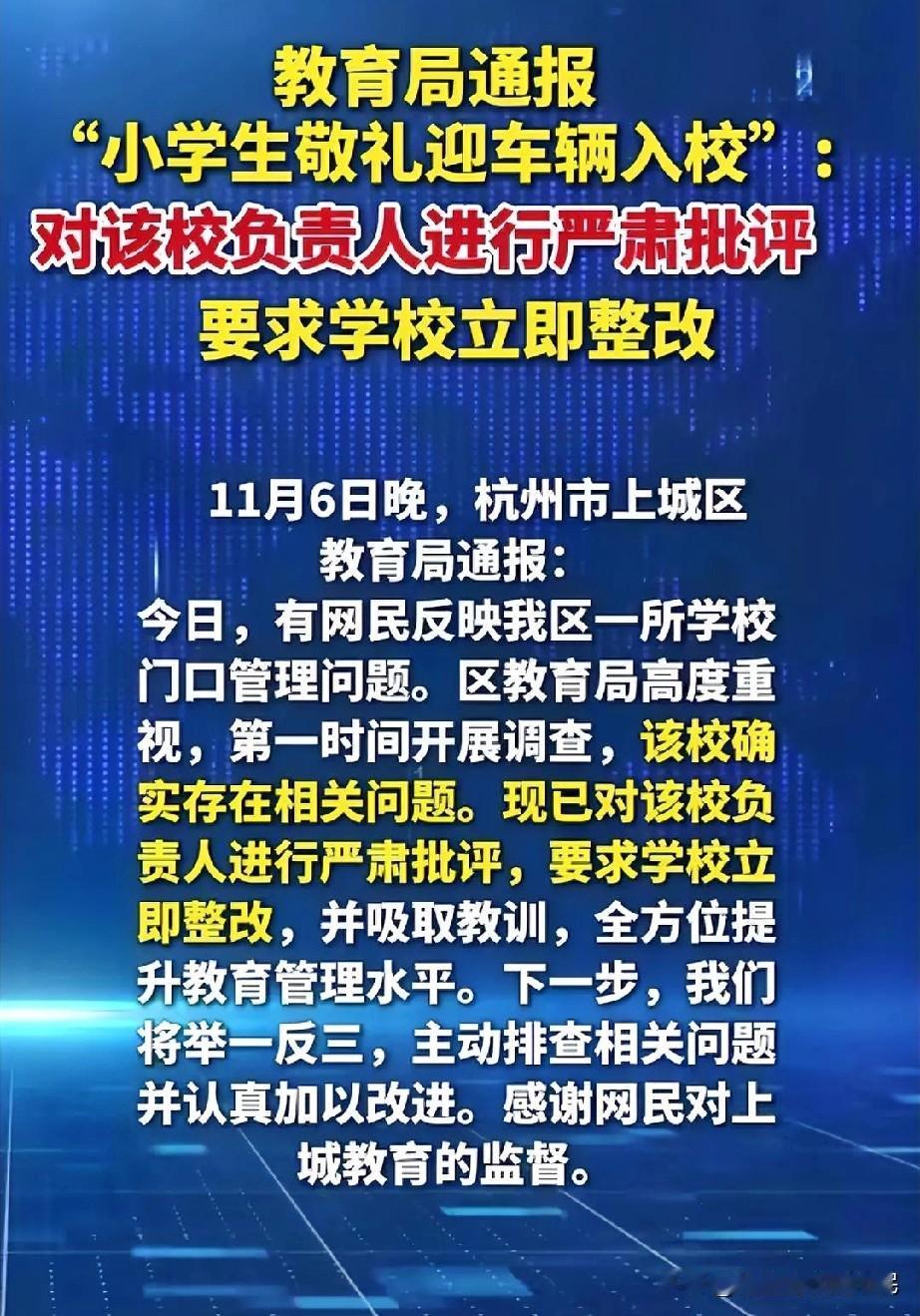 杭州小学生,早迎老师开车入校,还叫老师早上好,这么早就、安排来当小保安了,这教育真超前。入校不应该是走进去的吗?要全国各地都整改,很多学生已经站了一年了,每天早上都要比同学早去半小时站门口迎宾。两个问题,一是车俩进去学校,有没有人车分流的安全问题,二是礼节问题,既然敬礼就要还礼的问题。学生执勤是正常的,毕竟需要爱护自己的校园,但是,老师开车进入校园又安全隐患,不是不让老师开车,可以早到 30 分,提前于学生。还是教育局的处理方法得民心,再看看学校的处理方式,不承认自己的错误还要报警,报警了让警察叔叔怎么处理,难道表扬你们,我看笑话你们吧。应该互换一下,让老师们早点到学校门口站岗,迎接学生,并大喊学生早。