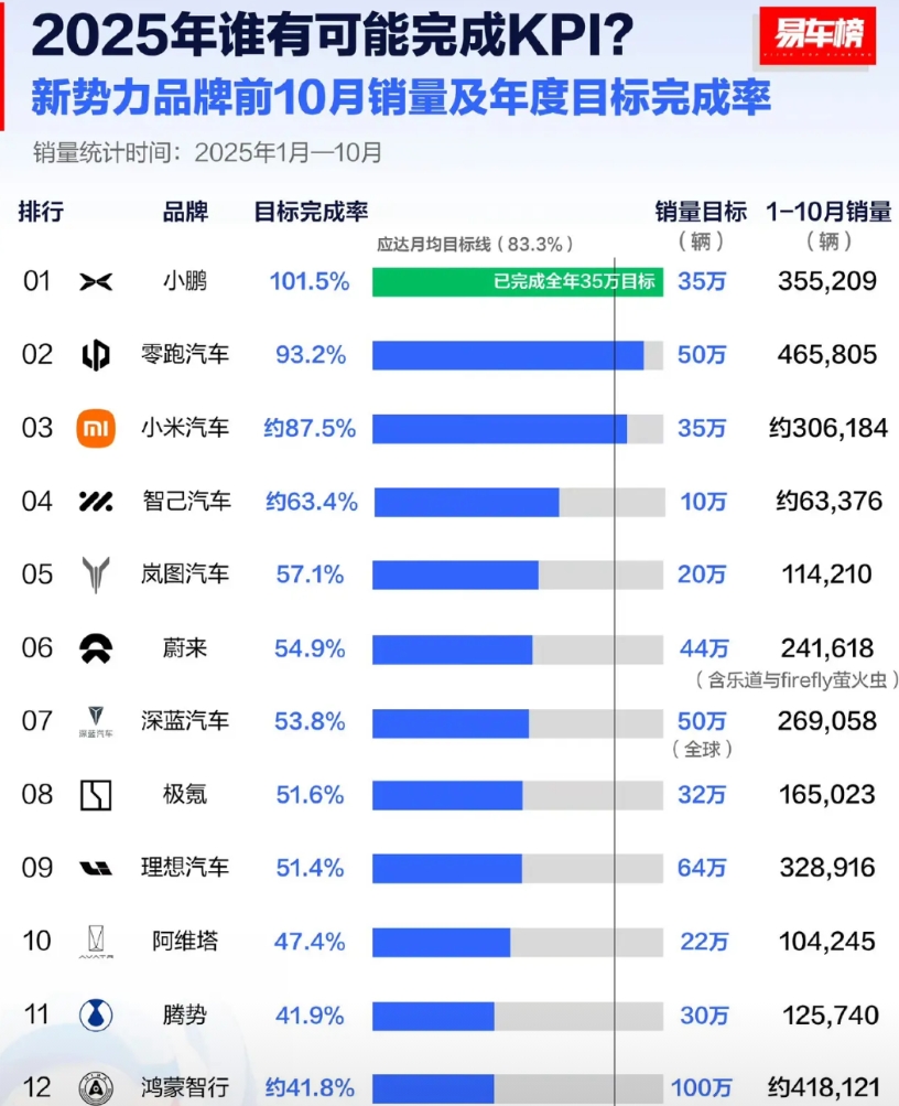 小鹏提前完成年度销量目标,某些却不到一半。2025年过去了一大半了,来看一下各家销量计划完成情况吧,小鹏汽车得益于mona03的发布,给品牌贡献了不少销量,零跑厚积薄发,完成年度目标也不是问题,小米每台车都是爆款,完成目标也不在话下,剩下的几家可能比较难了,某些品牌从现在起每天卖一万两都完成不了目标。