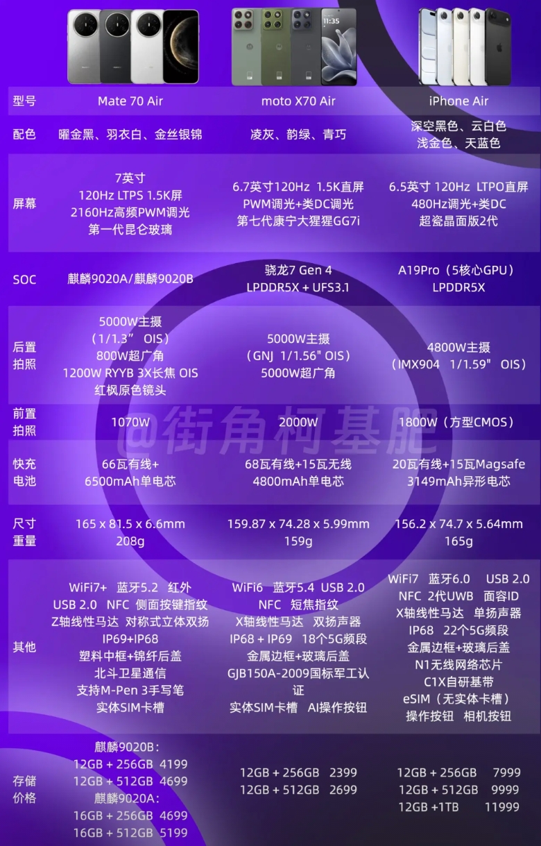 华为Mate 70 Air 对比联想moto X70 Air、苹果iPhone Air!虽然都是叫Air,但是定位有着明显的区别,iPhone Air追求极致轻薄,但随之也妥协了一些配置,影像、电池、扬声器等等; moto X70 Air则用相对更低的起步价来吸引用户,降低入手门槛,对影像和性能要求不太高的用户,想尝鲜超薄手机的很合适; 华为Mate 70 Air则在做薄的基础上把屏幕扩展到7英寸,变成超薄大屏机。薄度以及重量都没有很极致,但整体配置相对均衡,电池给到6500mAh,影像上主摄更好,还有长焦的加入,个人感觉更像是此前Mate 20X的升级版。对了,处理器有两个版本,一个麒麟9020A,一个麒麟9020B。