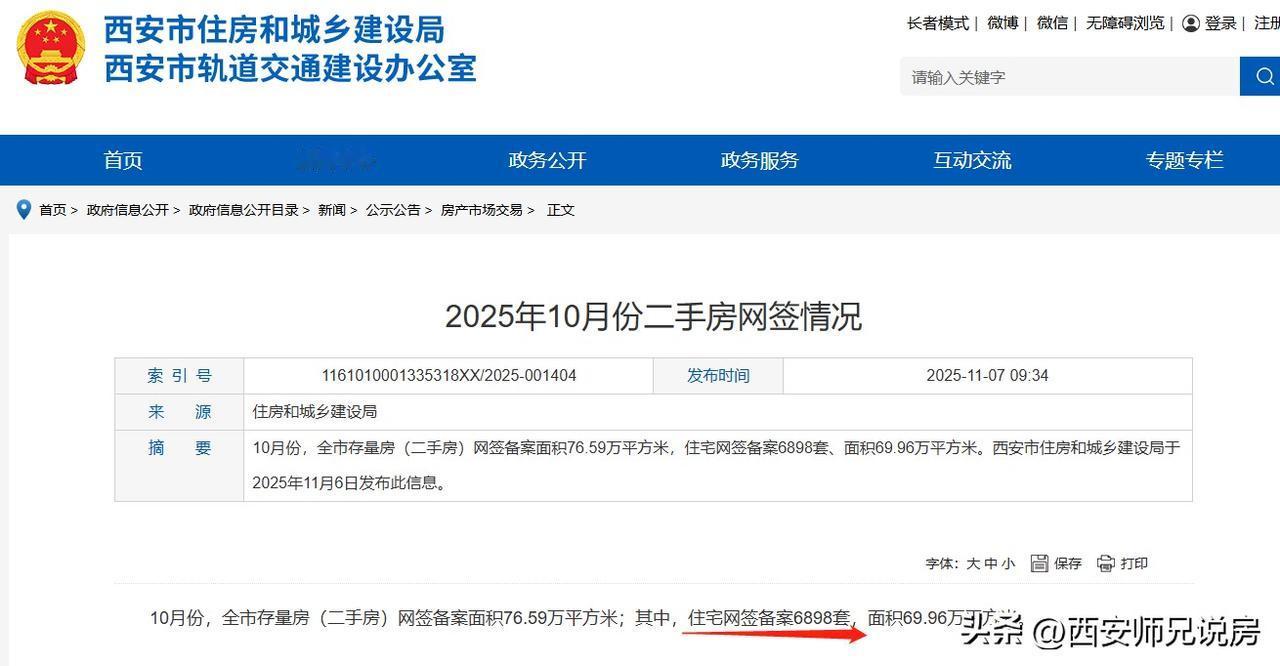 有网友调侃西安二手房是止涨转跌! 据西安住建今日公布,10月,全市存量房(二手房)网签备案面积76.59万平方米,住宅网签备案6898套、面积69.96万平方米。 相较9月份,成交套数减少672套,环比下跌8.88%;与去年同期相比,下跌25.44%,呈现“双降”态势。这也是今年除1月春节之外的第二低。 通过国家统计局发布的一些数据可以看出,目前西安二手房环比下跌1.02%,均价为11818元/平米,今年以来,西安二手房几乎每个月跌幅都徘徊在0.8%上下;反观新房市场,却出现另一番景象。10月份,西安新房却出现上涨,环比上涨0.56%,均价为16750元/平米;根据全国100城房价回撤数据统计可以看出,西安房价已经跌回至2018年5月份水平了,距离房价最高点已经下跌了30.7%,看完这些数据后,也就不难理解为什么现在二手房市场一片哀鸿遍野了,天天降价,没有最低价,只有更低价! 对于当前房地产市场而言,很多人是没有勇气和信心的。特别是之前了解过房价的人,对于当下不断下跌的房价,既关心,又害怕。这个时候不是真的需要房子来解决居住和一些实际问题的人,真的不敢轻易下手!西安楼市 西安房价