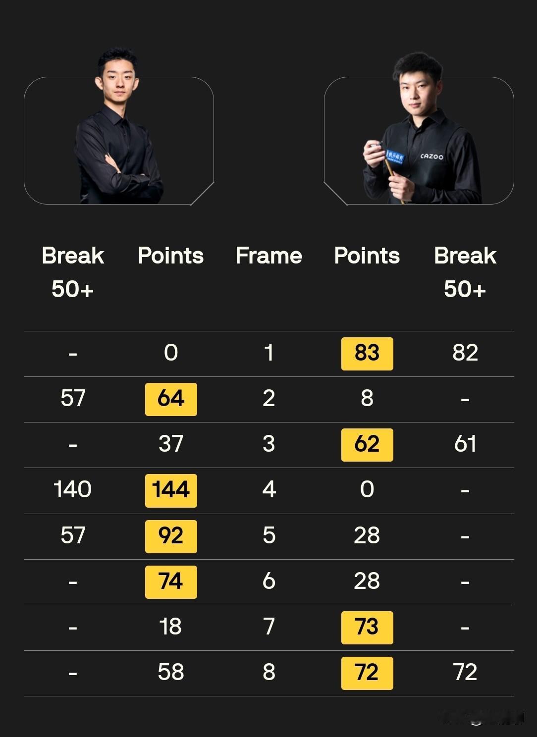 赵公子上半场打得稀碎,数次简单球失误加各种防守漏球,居然还能紧咬住比分。整体来看吴宜泽打得更合理和果断,该把握住的机会都兑现了,如果下半场能继续保持专注,赵公子想赢会很难。 两人上半场共打出一杆破百,5杆50+,几乎没有什么太多的防守环节,节奏还是挺快的。下半场如果还是这个方式进行下去,现场的观众还真是可以大饱眼福了。