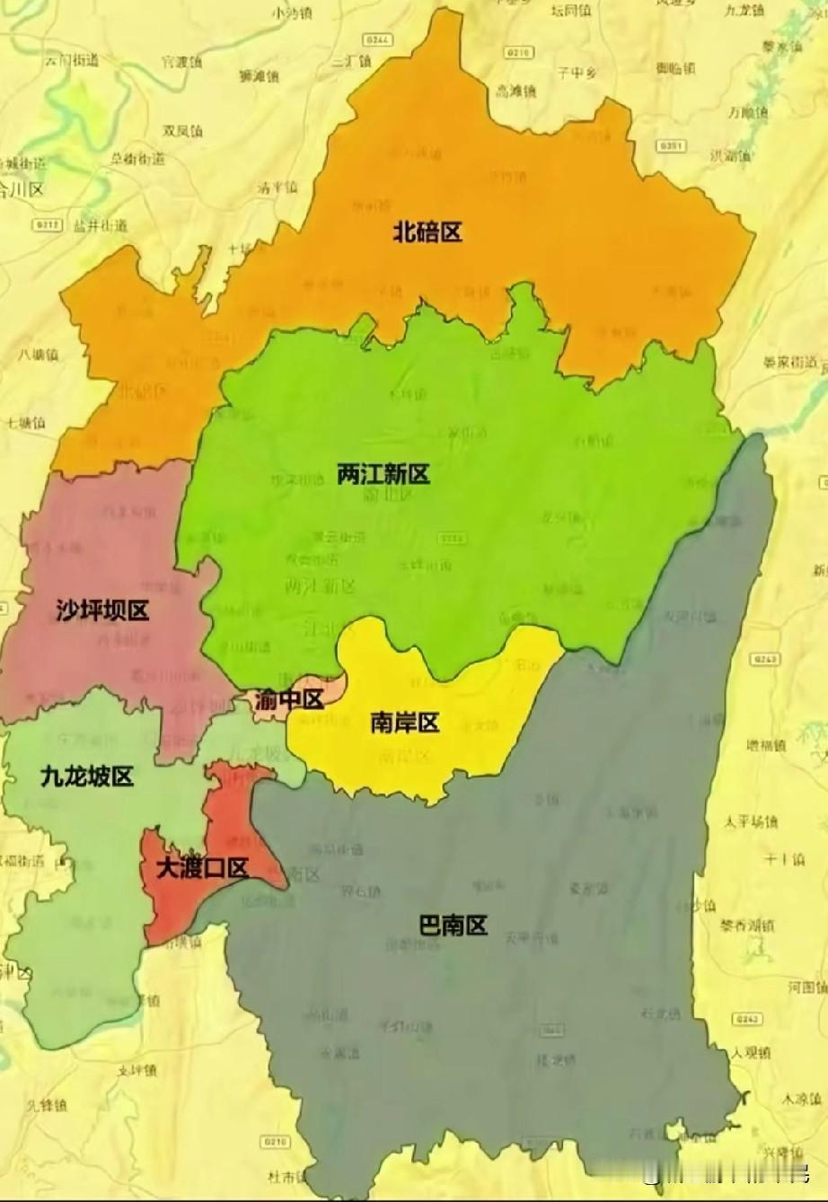 渝中与南岸合并,九龙坡与大渡口合并。中心城区由九个撤并为六个:两江新区、渝中南区、沙坪坝区、九龙渡区、北碚区、巴南区。每个区的体量比较合理。