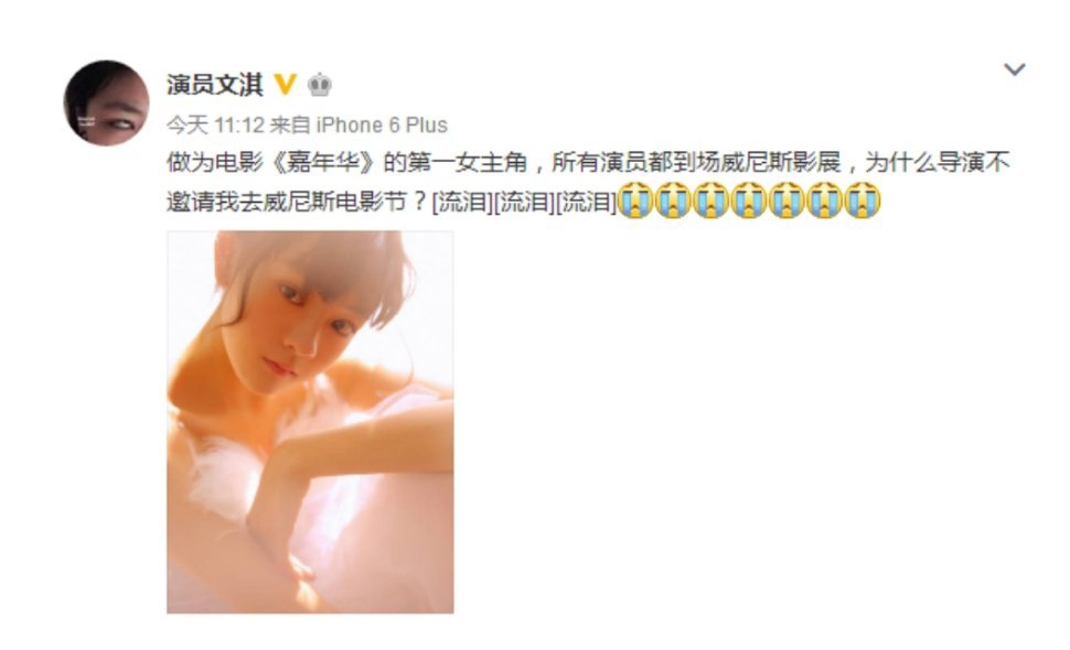 文淇曾被缺席威尼斯电影节2017年9月7日,导演文晏携主创周美君、史可、耿乐、彭静、王栎鑫亮相威尼斯国际电影节。而《嘉年华》女主角文淇却未能到场,并在微博上连发十个流泪的表情表达自己心中的遗憾之情,并对“导演未曾邀请自己”提出了疑虑。而今年东京电影节《春树》剧组也没有邀请白百何参加闭幕式。