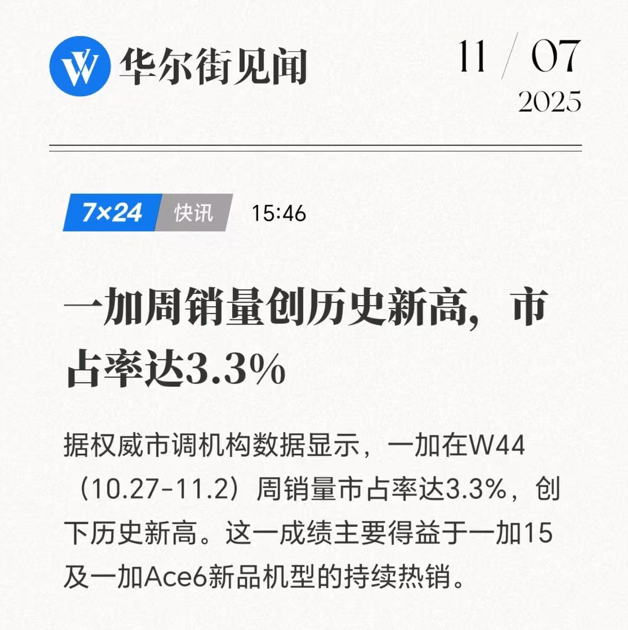 得益于一加15和一加Ace 6两款机型的上市,一加在第44周(10.27-11.2)销量市占率达到3.3,创下历史新高。看来这两款手机卖的还不错啊,165Hz的屏幕对游戏党来说还是很有吸引力的。