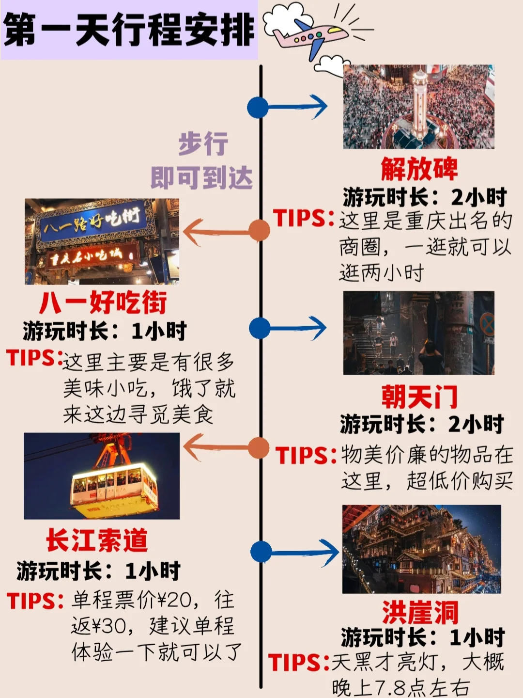 解放碑步行街[地点]→ 八一好吃街[地点]→ 朝天门码头[地点]→长长江索道[地点]→洪崖洞民俗风貌区[地点]
