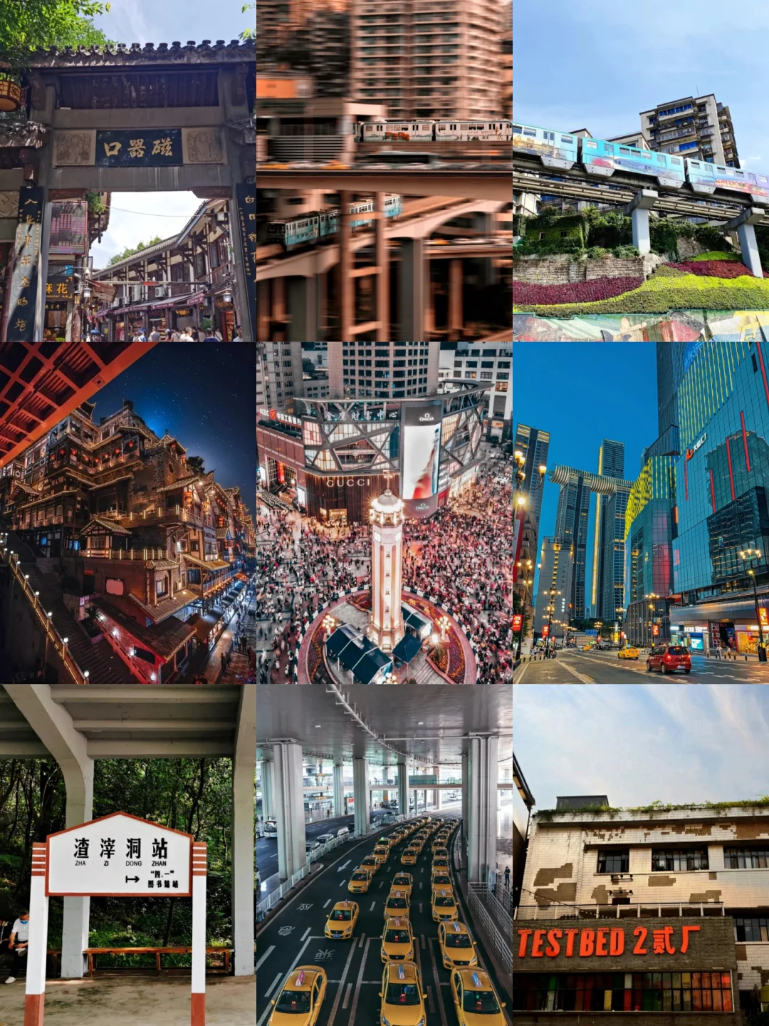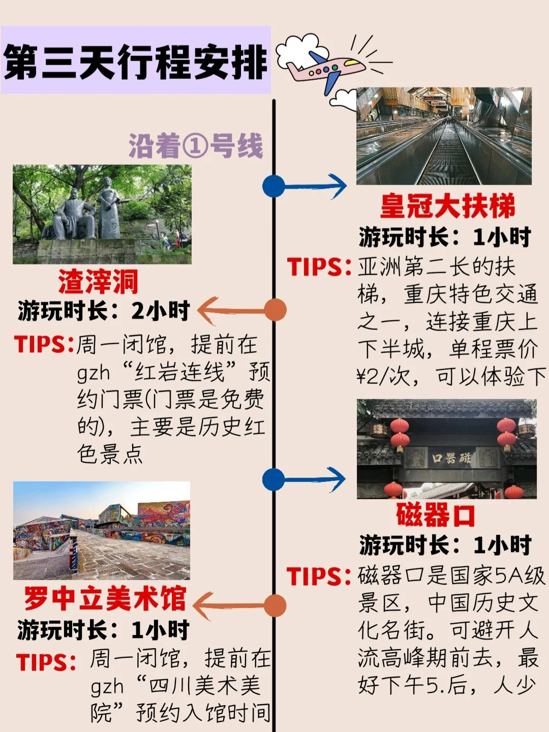 皇冠大扶梯[地点]→渣滓洞[地点]→ 磁器口古镇[地点]→ 罗中立美术馆[地点]