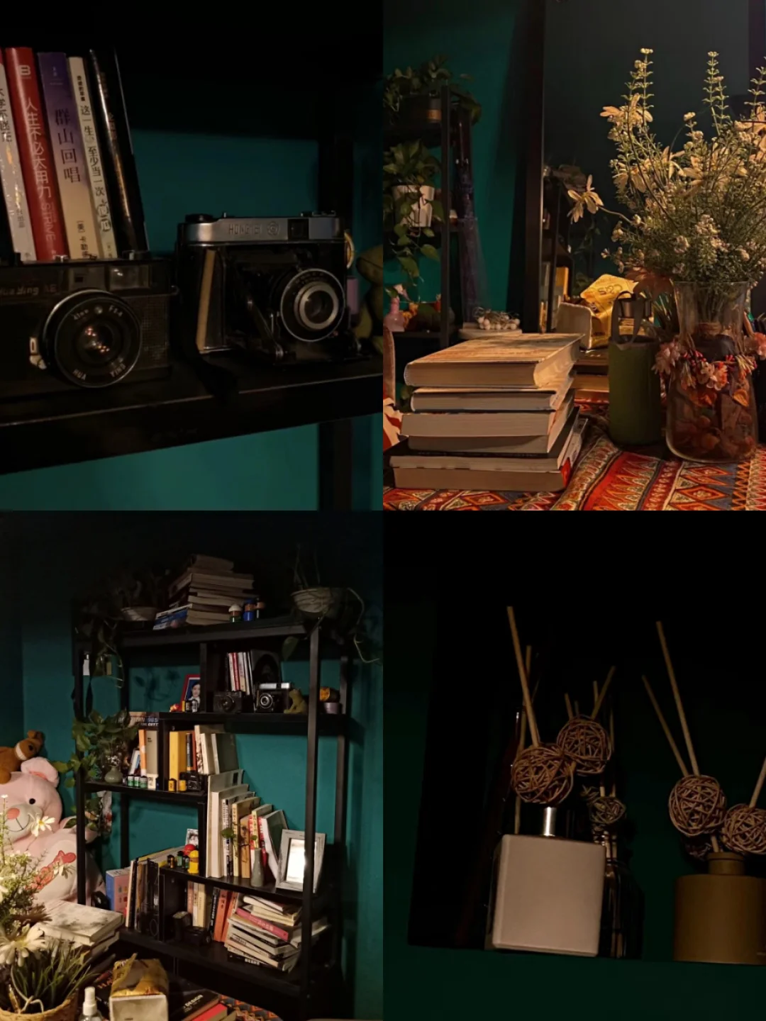👉关于环境:整个工作室不大,但该有的都有,整体环境是偏墨绿色的复古风,有可供拍照的一角