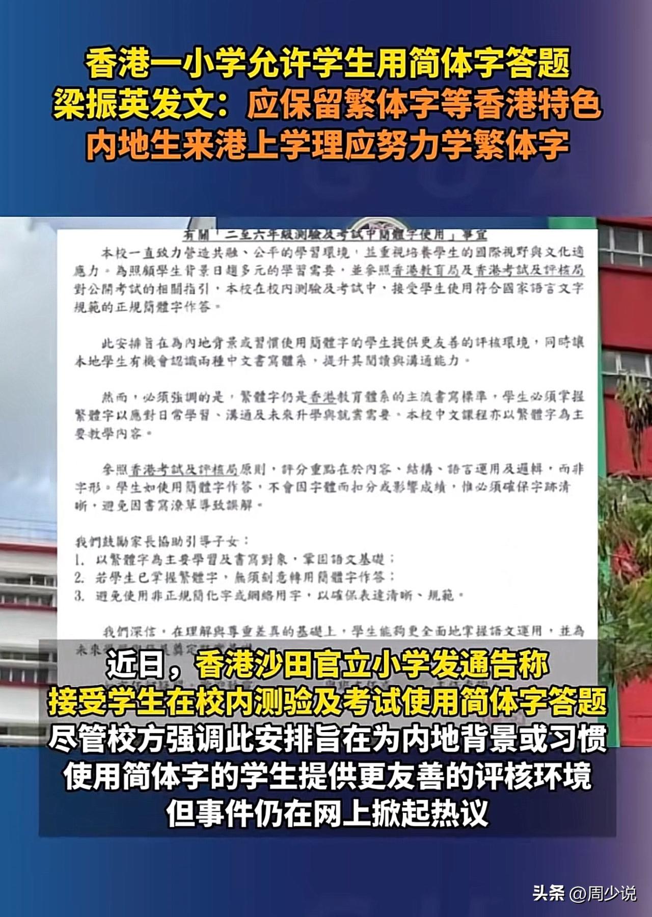#香港一小学允许学生用简体字答题#“确实罕见!”香港一小学近日放宽答题书写要求,允许学生使用简体字作答,此举引发广泛关注。 前特首梁振英就此发文表态,认为应保留繁体字等香港特色,强调内地生来港上学理应努力学习繁体字,融入本地教育环境。 消息传开后,网友观点两极分化。有网友支持学校:“简体字书写高效,兼顾不同背景学生,更显教育包容”; 也有网友认同梁振英:“繁体字承载香港文化记忆,保留特色很有必要”; 还有网友建议:“可双向兼顾,既尊重文化差异,也不忽视教育适配性”。 在周少看来,这场争议的核心是文化传承与教育包容的平衡。学校允许简体字答题,是对多元学情的体谅,体现教育温度; 而梁振英强调的繁体字保护,关乎地域文化根脉的延续,同样值得重视。真正的文化传承从不是非此即彼,而是在尊重差异的基础上相互理解,让不同书写习惯的学生都能在教育中感受到文化的力量,这才是教育应有的模样。 对于香港一小学允许学生用简体字答题,大家是支持还是反对呢?#长沙新朋友# #寻美三湘#