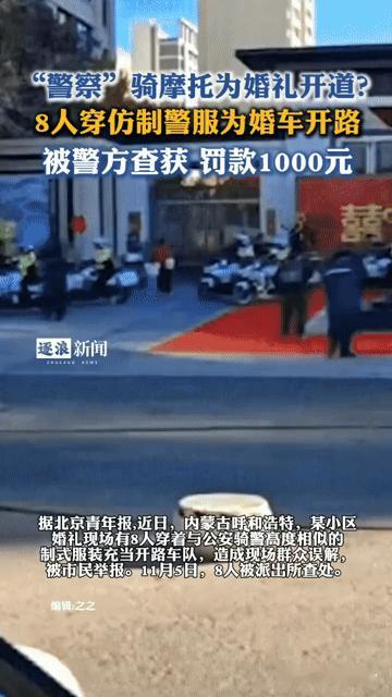 警察骑摩托给婚礼开道?别被骗了!8人穿仿制警服博眼球,结局大快人心 “警察骑摩托给婚礼开道?”别被这阵仗唬住!近日内蒙古呼和浩特一场婚礼上,8个“李鬼”身着与真警服高度相似的仿制服装,装模作样当起“开路队”,把现场群众骗得晕头转向。 他们本是婚车服务从业者,为博“排面”,竟私下网购仿制警服搞噱头。好在群众火眼金睛,当即举报。警方查明,这群人既非正式民警,也不是警务辅助人员,纯粹靠“角色扮演”博关注。 最终,8人因违法被依法处罚,罚款、记分一个不落。想靠歪招撑场面?法律可不惯着!这种混淆视听的闹剧,终究自食恶果,看得人直呼痛快!