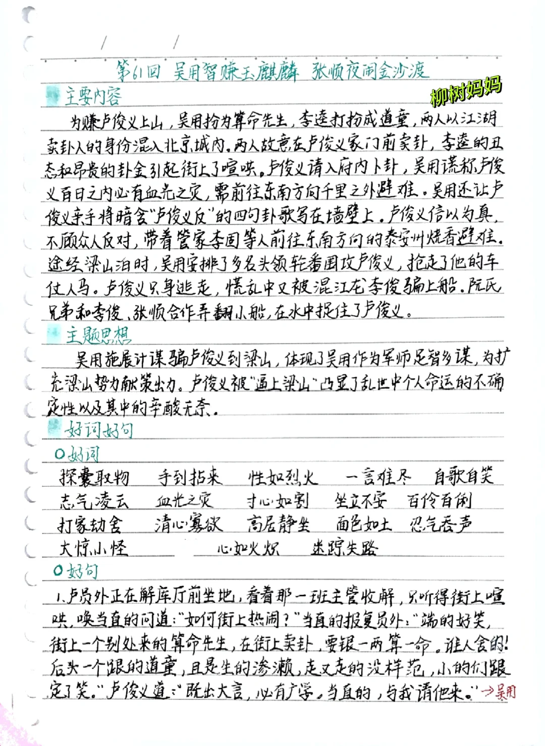 《水浒传》第61回 吴用智赚玉麒麟 张顺夜闹金沙渡 [清单R][清单R]主要内容 [清单R][清单R]主题思想 [清单R][清单R]好词好句 [清单R][清单R]阅读感悟