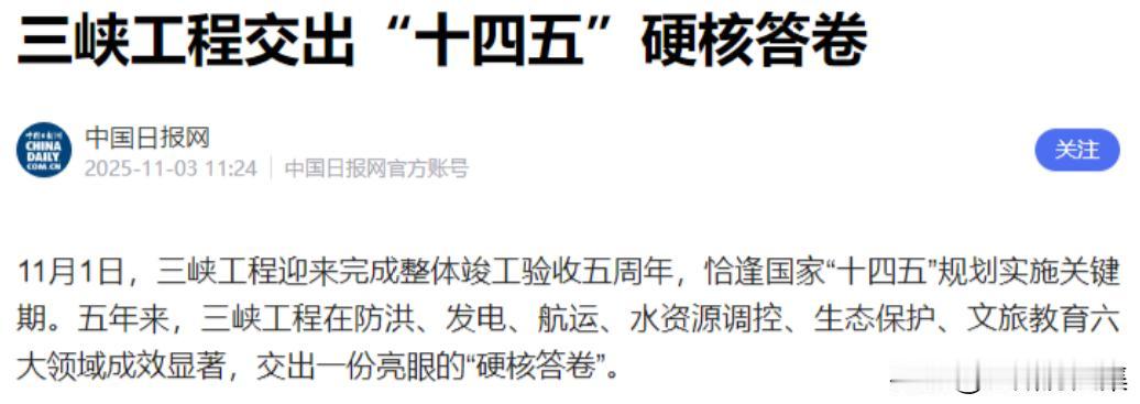 三峡大坝“账本”出炉:运行了20余年,2500亿投入如今回本了吗? 这问题压根不用多猜,2500 亿早就连本带利赚回来了,而且这笔买卖的收益比当初规划的还丰厚,说是稳赚不赔的 “世纪生意” 一点不夸张。当初计划投 2500 亿,结果实际花的钱比预想少得多,三峡集团披露的动态总投资还不到 2090 亿。 能省下这么大一笔,关键是大坝建到一半就开始 “赚钱养家” 了 ——2003 年首批机组就正式发电,从那会儿起这颗能源心脏就没停过造血,一边建设一边创收,成本自然就摊薄了不少。 先说说最直接的发电收入,这可是账本里的 “硬通货”。三峡电站总装机容量 2250 万千瓦,2023 年就算来水比常年偏少 24%,发电量还达到了 802.71 亿千瓦时,比前一年还多了点。运行这二十多年,累计发电量早超过 1.7 万亿千瓦时了。 更厉害的是水电这行当的成本优势,燃料费几乎为零,大头支出是折旧,可这折旧就是账面上的数字 —— 大坝按 50 年折旧算,但实际每年维护也就 20 亿,远低于账面折旧成本。 2024 年三季度光折旧贡献的现金流就占了经营现金流净额的 57% 以上,等于账面扣了钱,实际没花多少,这不就是 “躺着赚现金流” 嘛。 按平均上网电价算,一天发电量差不多 2.74 亿千瓦时,光电力收入就有 6.85 亿,广东那边电价更高,实际收益还得往上走。 长江电力靠着这水电站,近十年净利率稳定在 40% 以上,个别年份快到 50%,跟贵州茅台都有的一拼,这 “水电印钞机” 的名号可不是白来的。 防洪这块的账更得算细,虽然没法用精确数字衡量全部价值,但省下来的钱实实在在是笔巨款。1998 年长江特大洪水造成 1600 亿元损失,而三峡大坝运行这二十年,累计拦洪快 70 次了,拦洪总量超 2200 亿立方米。 就说 2024 年汛期,一次就拦了 126.8 亿立方米洪水,直接让长江中下游 700 公里河段没超警戒水位,光这一次避免的损失就超千亿元。 对江汉平原、洞庭湖平原的数千万人来说,这大坝就是汛期里最坚实的依靠,以前每逢汛期要动员百万军民防汛,现在有了水库拦洪,人力物力成本省了不说,更不用担惊受怕家园被淹。 航运带来的收益也逐年看涨。以前长江中上游全是浅滩,大船根本开不进来,货运成本高得吓人。 三峡大坝的双线五级船闸成了 “水上绿色通道”,2023 年过闸货运量达到 1.68 亿吨,比前一年增长 7.95%,从通航到 2025 年一季度累计货运量早突破 22 亿吨了。 现在每年航运年收入就超百亿,更别说物流成本降下来后,西南的矿产、建材运到沿海,沿海的工业品送到内陆,沿线经济都被带动活了,这连锁反应带来的收益可比直接运费多得多。 还有些 “隐形收益” 藏在账本角落,比如水资源调配。这二十多年三峡水库累计给下游补水超 3600 亿立方米,2022 年长江大旱时,不仅调度抗旱,还紧急给上海长江口补水压咸,保住了城市供水。 2025 年春天又三次补水保灌溉,帮着湘鄂地区夏粮丰收。这些补水保障了中下游的生产、生活和生态用水,要是没有这个 “水储备”,农业减产、工业停产的损失可就大了。 库区的发展收益也得算进去。以前库区不少地方是荒山,水土流失严重,现在靠着大坝带来的生态改善,发展起了特色产业。 重庆奉节大坝村种了 1.2 万亩脐橙,年产值 1.8 亿,还靠着花果景观搞旅游,年接待游客 2.5 万人次,旅游收入 200 万。巫山全县 14 万亩脆李,一年产值 21 亿,巫溪的太白贝母每亩收益能超 20 万,村民光卖种子就能赚几十万。 忠县更是靠柑橘产业把 20 余万亩荒山变成生态走廊,还成了 “绿水青山就是金山银山” 实践创新基地。 这些年库区培育了 46.8 万亩生态农业园,新增 94.1 万个就业岗位,GDP 年均增长率比全国高 6.6 个百分点,这都是大坝带来的长远红利。 当然账本里也记着持续投入:每年移民补助要 96 亿,生态修复花 25 亿,加上维护成本,累计运行管理投入超 1600 亿元。 但算总账就清楚了,光发电和航运的直接收益就达 1.12 万亿元,是总投资的 4.48 倍,加上防洪减损更是突破 1.22 万亿元。而且大坝设计寿命长达百年,现在才刚运行二十多年,往后还有几十年的收益期。 当初有人担心这笔投资收不回来,现在看纯属多余。这大国重器不仅没让人失望,还交出了一份远超预期的成绩单,既撑住了能源、防洪的基本盘,又带动了区域发展,这笔账怎么算都划算。 参考资料:环球时报《三峡工程开工建设30年来效益显著》
