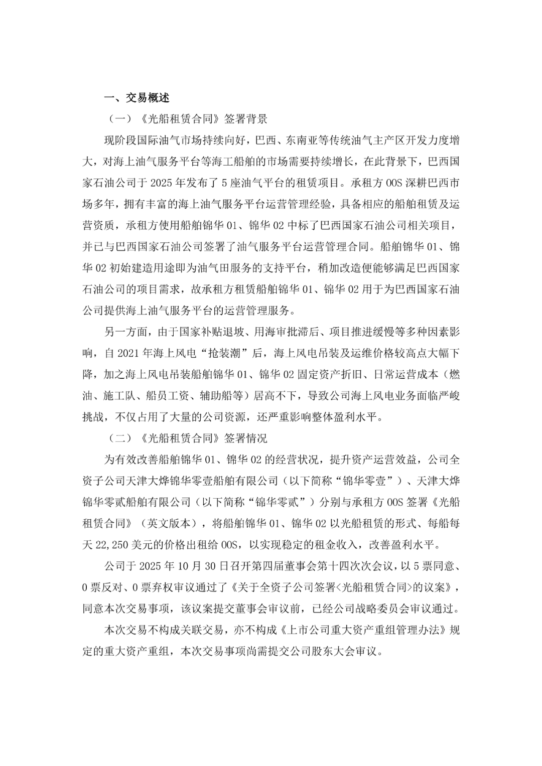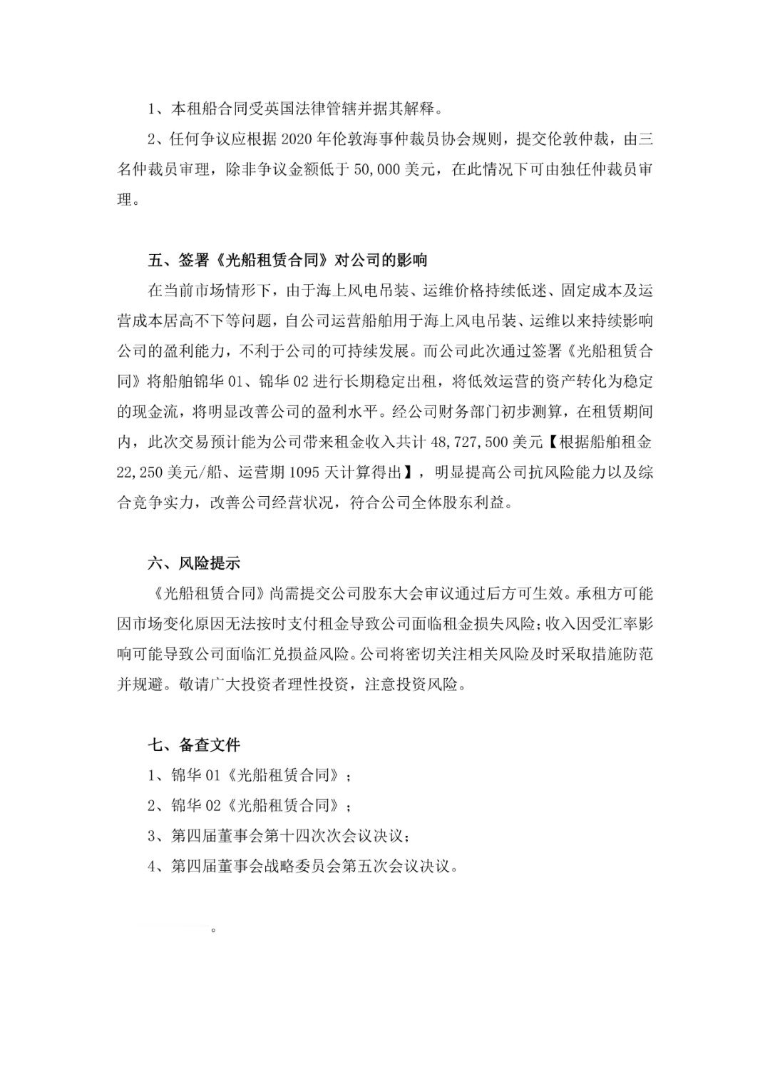 为有效改善船舶锦华01、锦华02的经营状况,提升资产运营效益,公司全资子公司天津大烨锦华零壹船舶有限公司、天津大烨锦华零贰船舶有限公司分别与承租方OOS签署《光船租赁合同》,将船舶锦华01、锦华02以光船租赁的形式、每船每天22,250美元的价格出租给OOS,以实现稳定的租金收入,改善盈利水平。