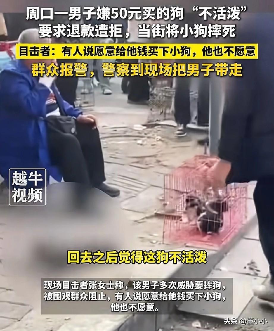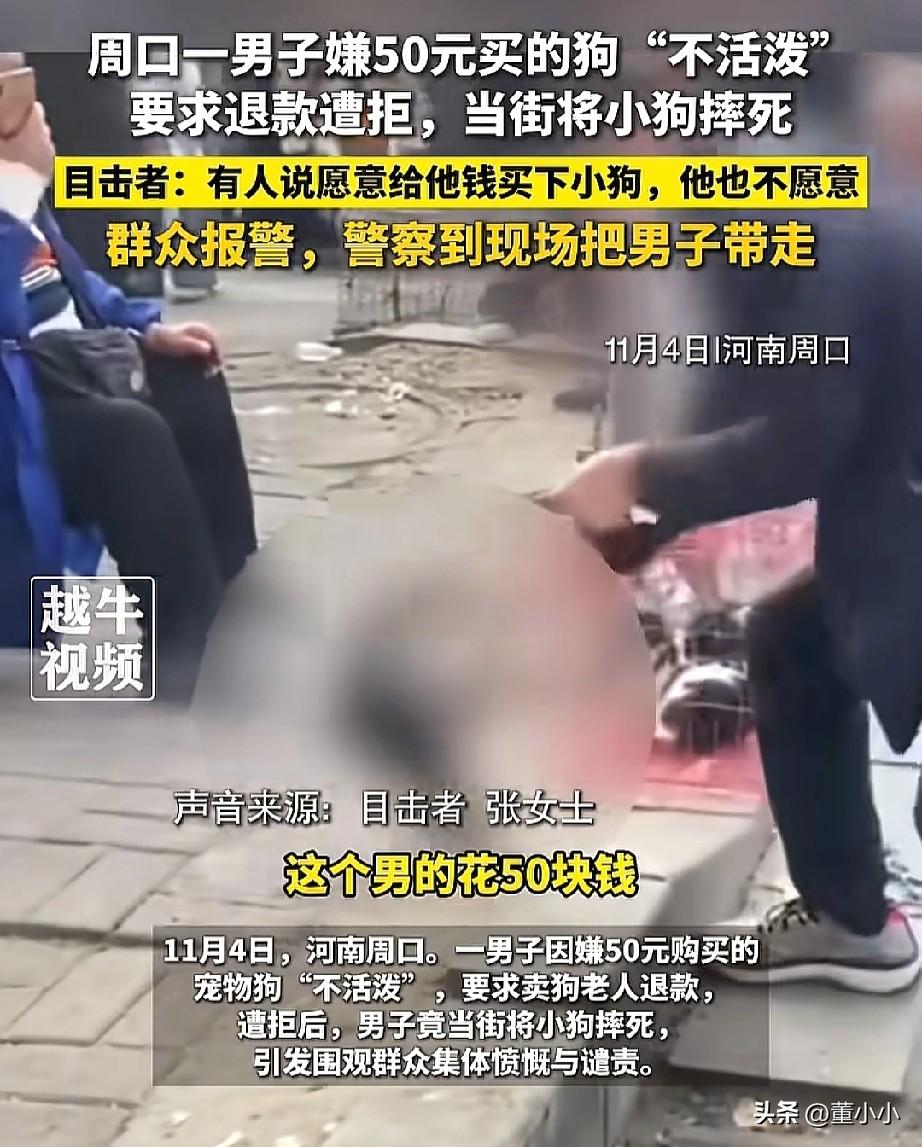 必须严惩!河南周口,一男子花了50元买了一条狗,回家之后又觉得这个狗不活泼,就跑过来退货,奈何老板不惯着,直接拒绝了男子的要求,男子这时来气了,直接放狠话,如果不退,就要在他面前摔死这个狗。 周围的人都在纷纷上前阻止,甚至有一位路人想要把这个狗买回去,男子却不愿意卖,直接拎着绳子狠狠的把狗摔在地上。 从视频中可以看到,真的够狠,摔了好几下,狗在地上一动不动。 不过好在有热心的群众帮忙报警了,直到警察来到现场后,男子才被带走。 刚开始不活泼很正常的呀。 面对一个陌生的主人,陌生的环境,当然不活泼了,但也不至于把狗摔死。 所以,情绪稳定才是一个人最好的素养, 因为情绪不稳定的人真的很可怕。 虽然我不养狗,但是这个男的行为真的太可恶了。