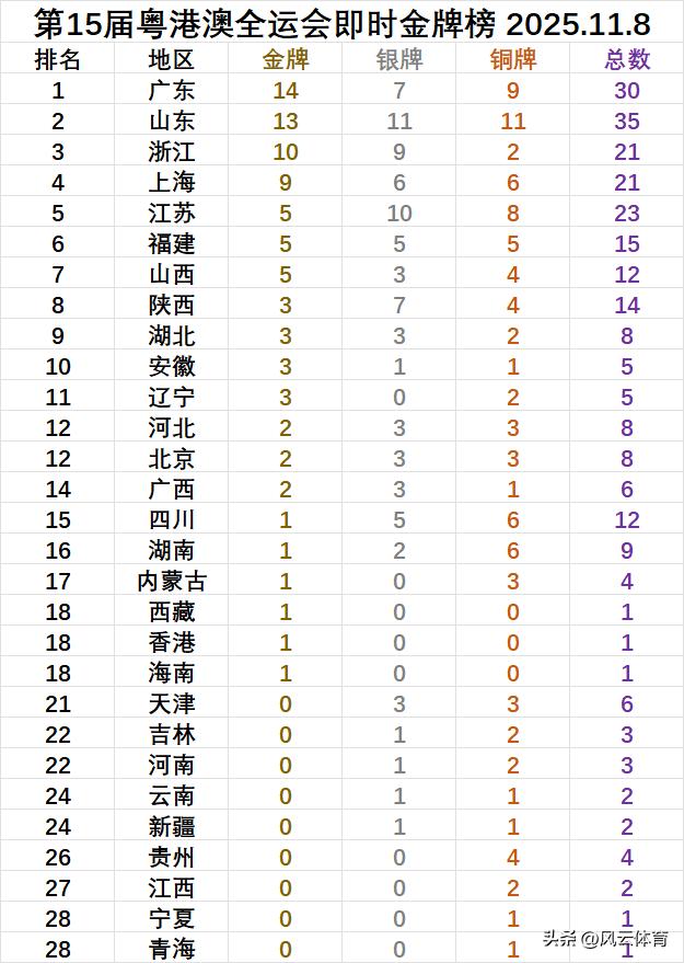 全运会最新奖牌榜:粤鲁榜首争霸!20个代表团金牌破“0” 距离第15届全国运动会仅剩最后一天时间,截止11月8日23:00,全运会奖牌榜方面,山东以总奖牌35枚居首,广东30枚位居第二。 而在金牌榜方面,广东则以14金暂居金牌榜第一,而山东以13枚位列第二。同样作为体育大省,近几届全运会上都呈现出“粤鲁争霸”的局面,本届全运会,作为东道主的广东也势必要拿下奖牌榜和金牌榜双第一。 另外,浙江依靠强大的游泳军团,目前也进账10金9银2铜,紧随广东和山东。上海同样保持了良好的竞争势头。目前这四支代表队组成金牌榜“第一档”。 江苏、福建携手“中部三省”山西、湖北、安徽、以及陕西和辽宁共同构成金牌榜“第二档”。此外还有河北、北京、广西、四川、湖南、内蒙古、西藏、香港和海南也都实现了金牌0的突破。