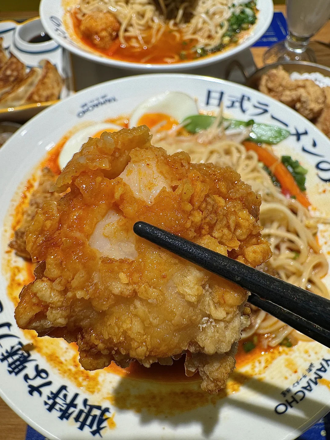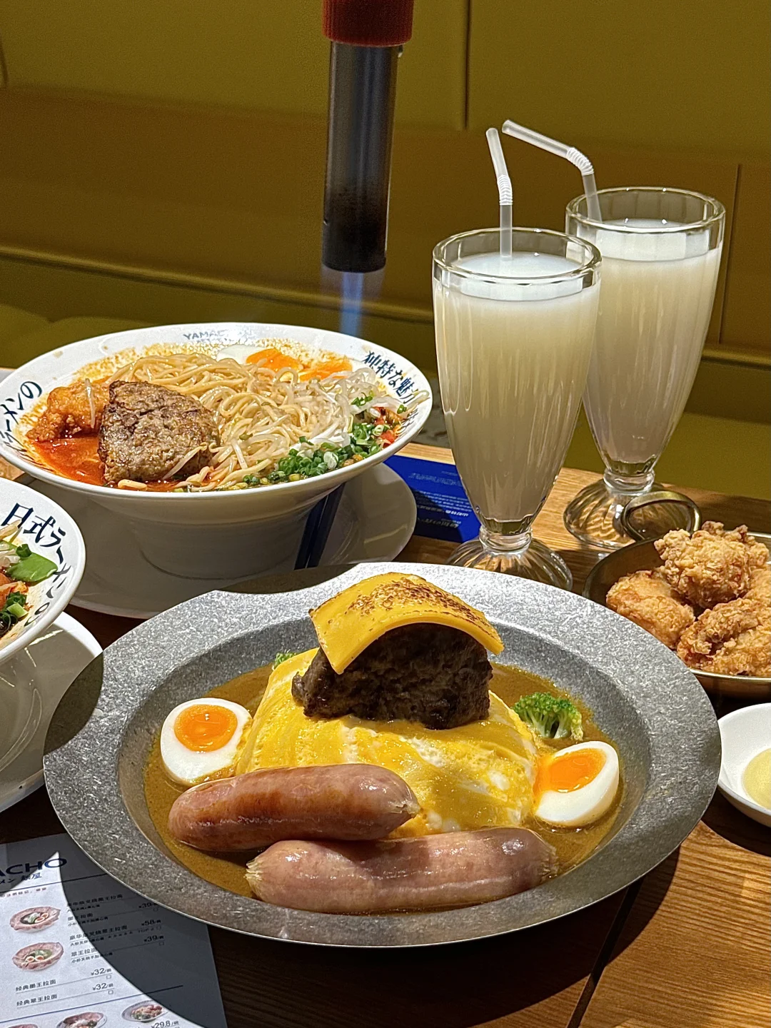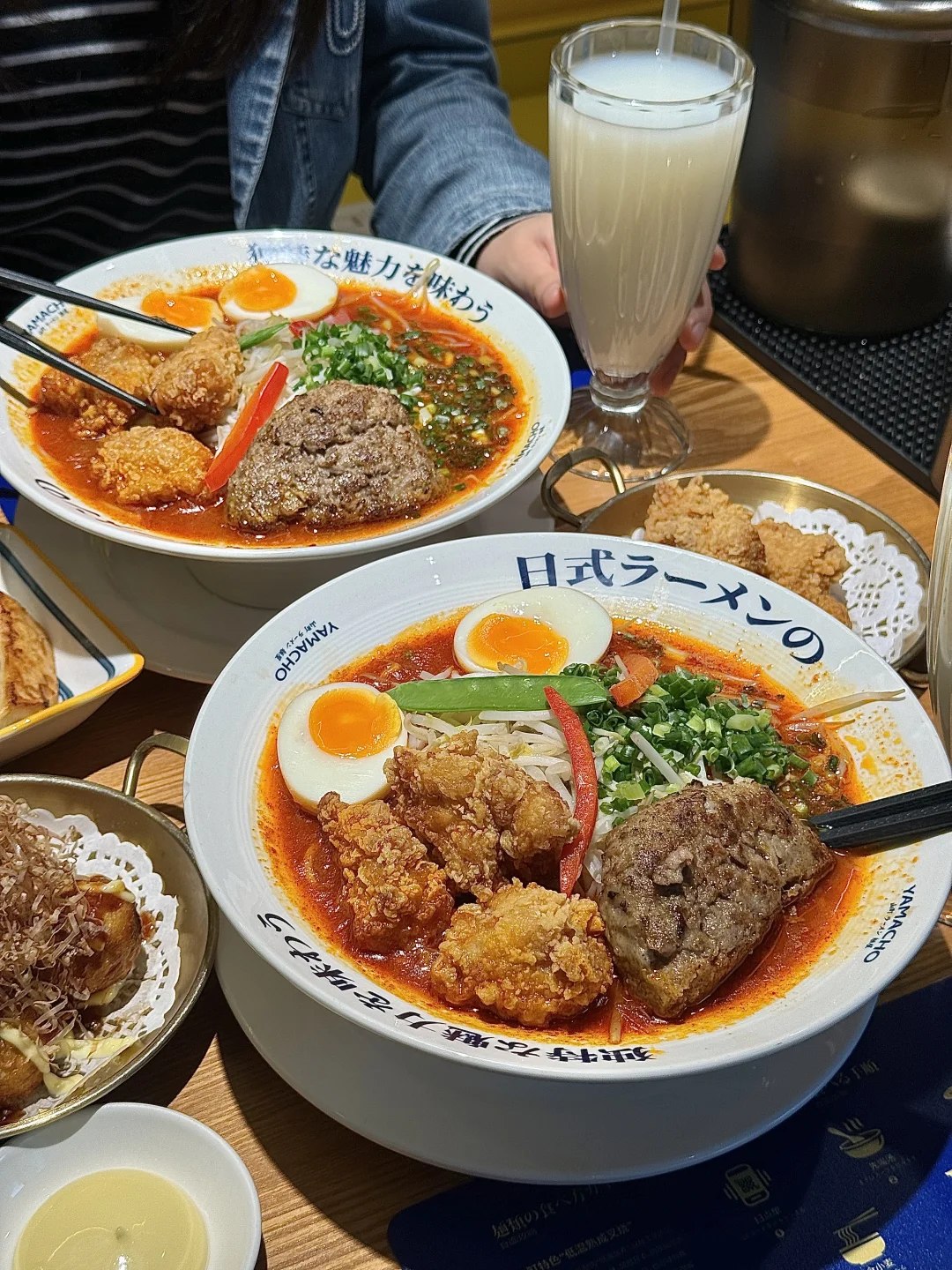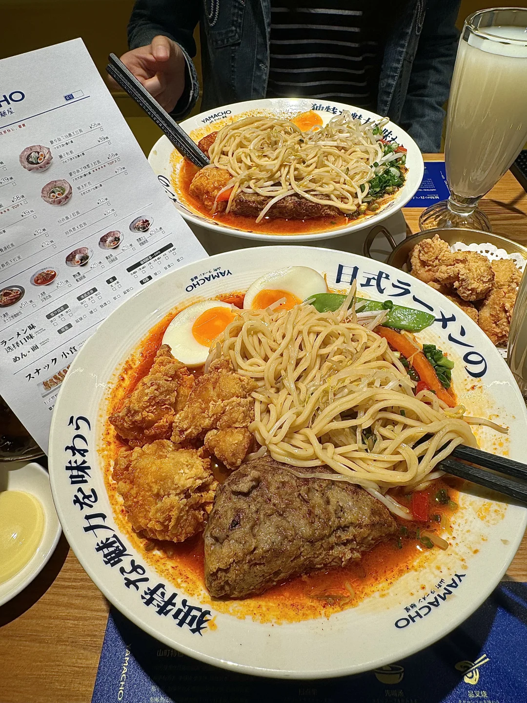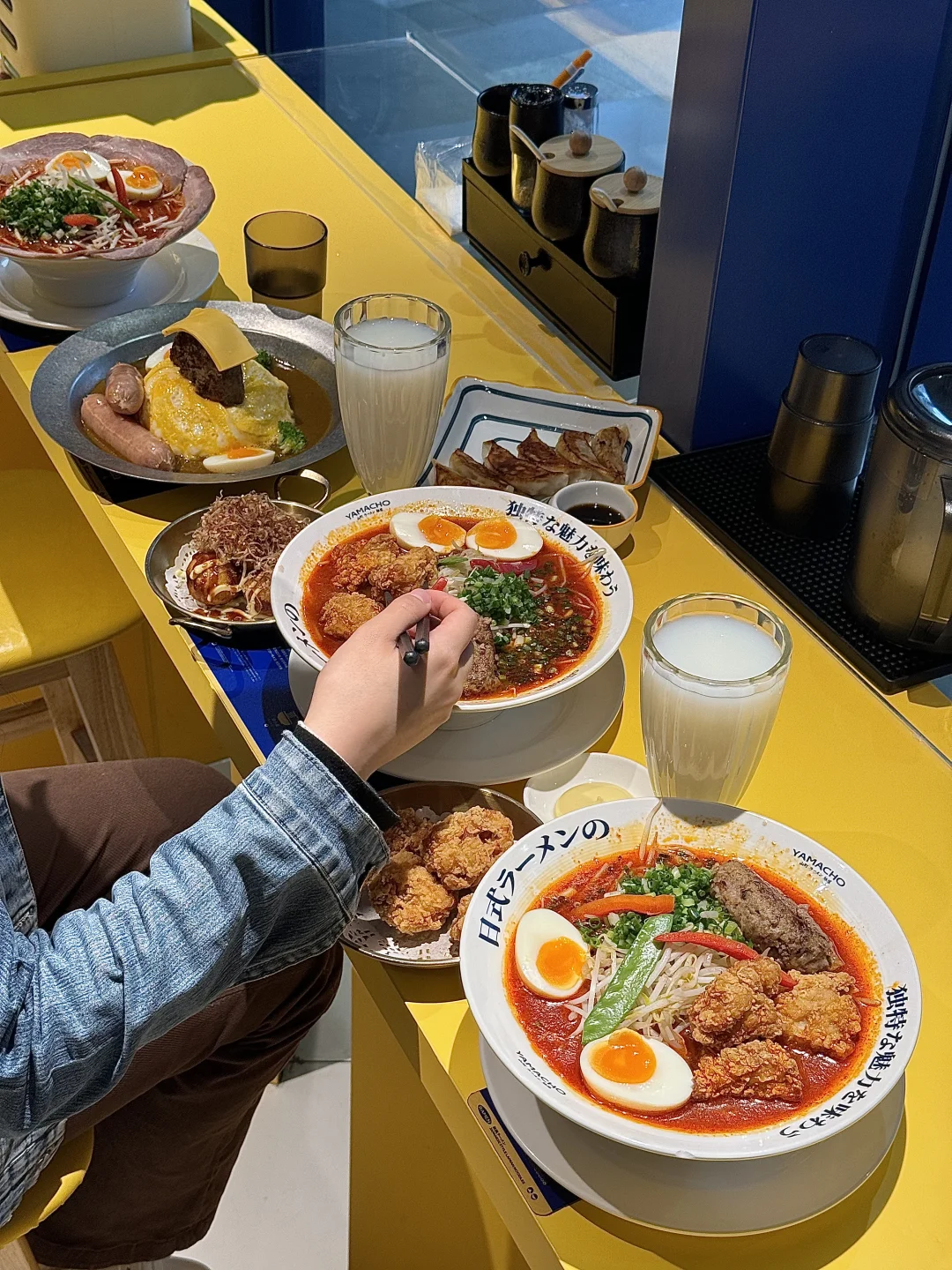 北外滩来福士超爱的一家日式拉面小馆子🍜 经常吃他家招牌豪华版叉烧豚汤拉面… 这次新出的大满贯焰王🍔汉堡拉面、芝士汉堡咖喱饭🍛真的硬控我!😅 超大超大份!汉堡肉和炸鸡块量也超多,肉好嫩一口爆汁🤤 微微辣口味真的巨好吃😋是连在汤底都喝光的程度……